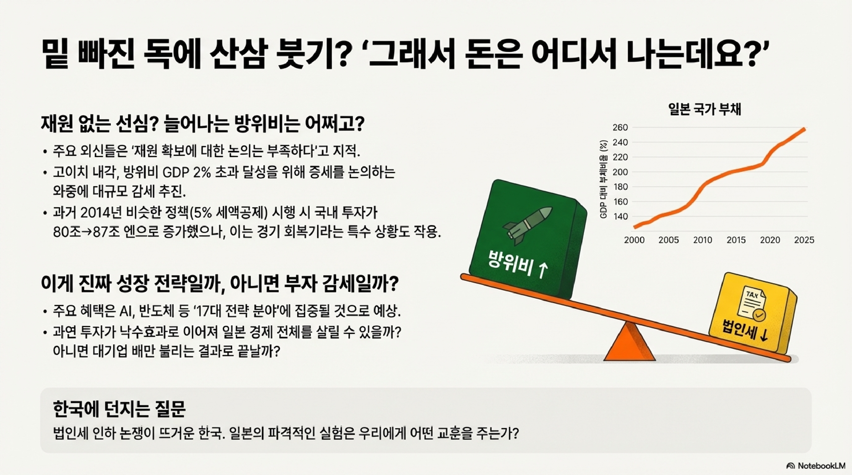 - 숨겨진 문제점: 하지만 세상에 공짜 점심은 없죠. 이 정책으로 줄어드는 세수가 연간 4000억 엔, 우리 돈으로 약 4조 원에 달할 것으로 예상되는데, "그 돈은 어디서 메꿀 건가요?"라는 근본적인 질문이 빠져있습니다. 재원 확보에 대한 논의는 쏙 빠진 채 대규모 감세부터 발표한 셈입니다. 사실 이런 투자를 유치하기 위한 감세 경쟁은 미국, 독일 등에서도 벌어지고 있는 글로벌 트렌드이긴 합니다만, 재원 대책 없는 감세는 미래 세대에게 부담을 떠넘기는 것과 다름없다는 비판을 피하기 어렵습니다.