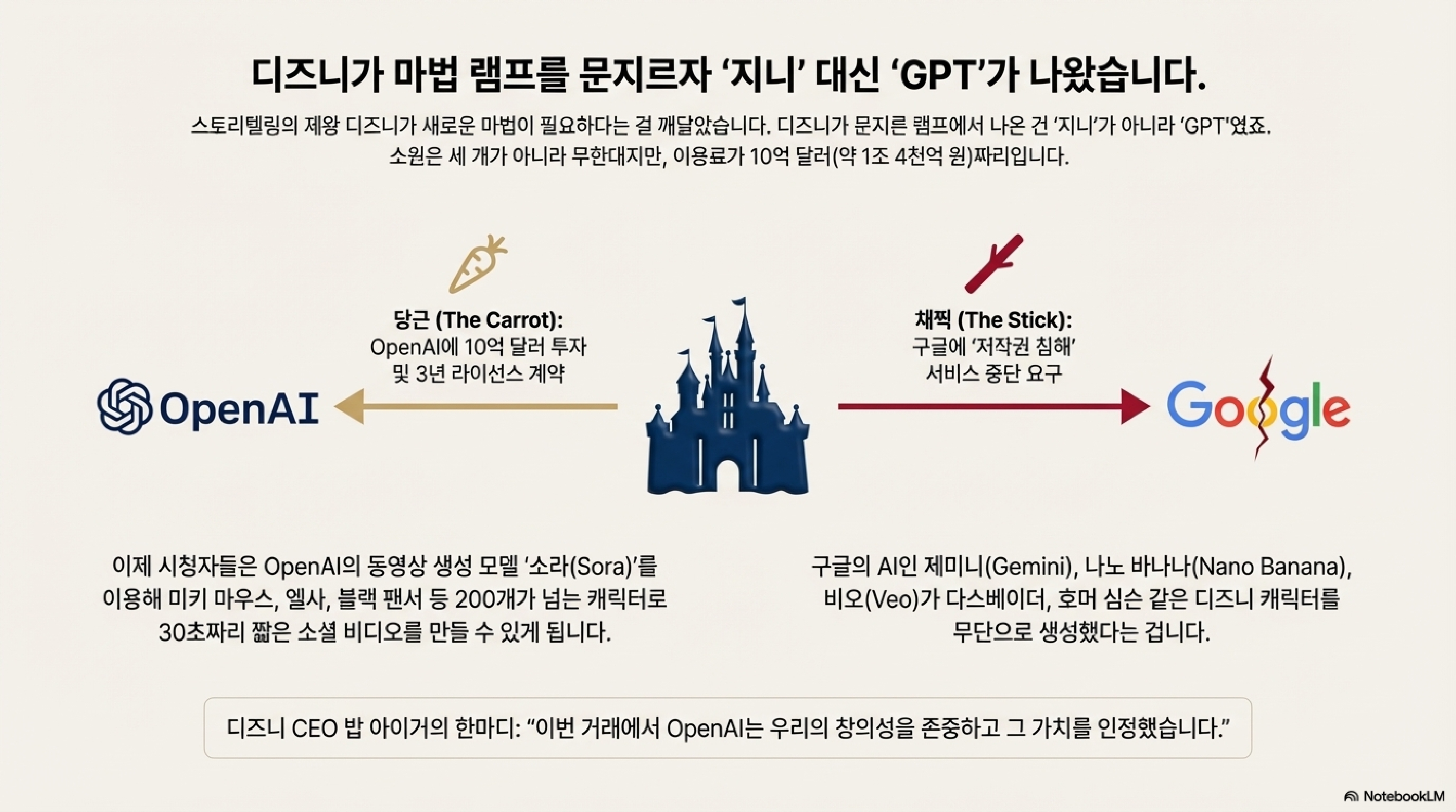 우선 '채찍'부터 보시죠. 디즈니는 OpenAI와의 초대형 계약 발표 바로 전날, 구글을 향해 아주 날카로운 채찍을 휘둘렀습니다. 구글의 AI가 자사 캐릭터들의 저작권을 "대규모로 침해했다"면서 '중지 요청서(cease-and-desist letter)'를 보낸 겁니다. 그리고 바로 다음 날, OpenAI에게는 아주 달콤한 '당근'을 건넸습니다. OpenAI에 무려 10억 달러(약 1조 4,000억 원)를 투자한 겁니다. 단순히 돈만 투자한 게 아닙니다. 디즈니는 OpenAI의 주식을 현재 기업가치 기준으로 살 수 있는 권리, 즉 워런트까지 챙기면서 이 게임에 장기적으로 베팅하겠다는 의지를 보여줬습니다. 여기에 더해 이백 개가 넘는 디즈니, 마블, 스타워즈, 픽사 캐릭터들을 OpenAI의 동영상 생성 AI '소라(Sora)'에서 사용할 수 있도록 삼 년간 라이선스 계약까지 맺었습니다.