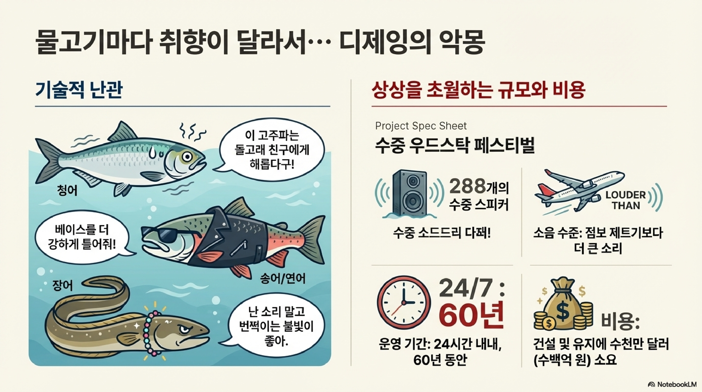 - 문제점: 그런데 물고기마다 음악 취향이 다 다릅니다. 청어는 고주파를 싫어하고, 송어나 연어는 둥둥 울리는 베이스를 싫어합니다. 심지어 장어는 소리에는 아랑곳하지 않고 오직 번쩍이는 불빛에만 반응합니다.