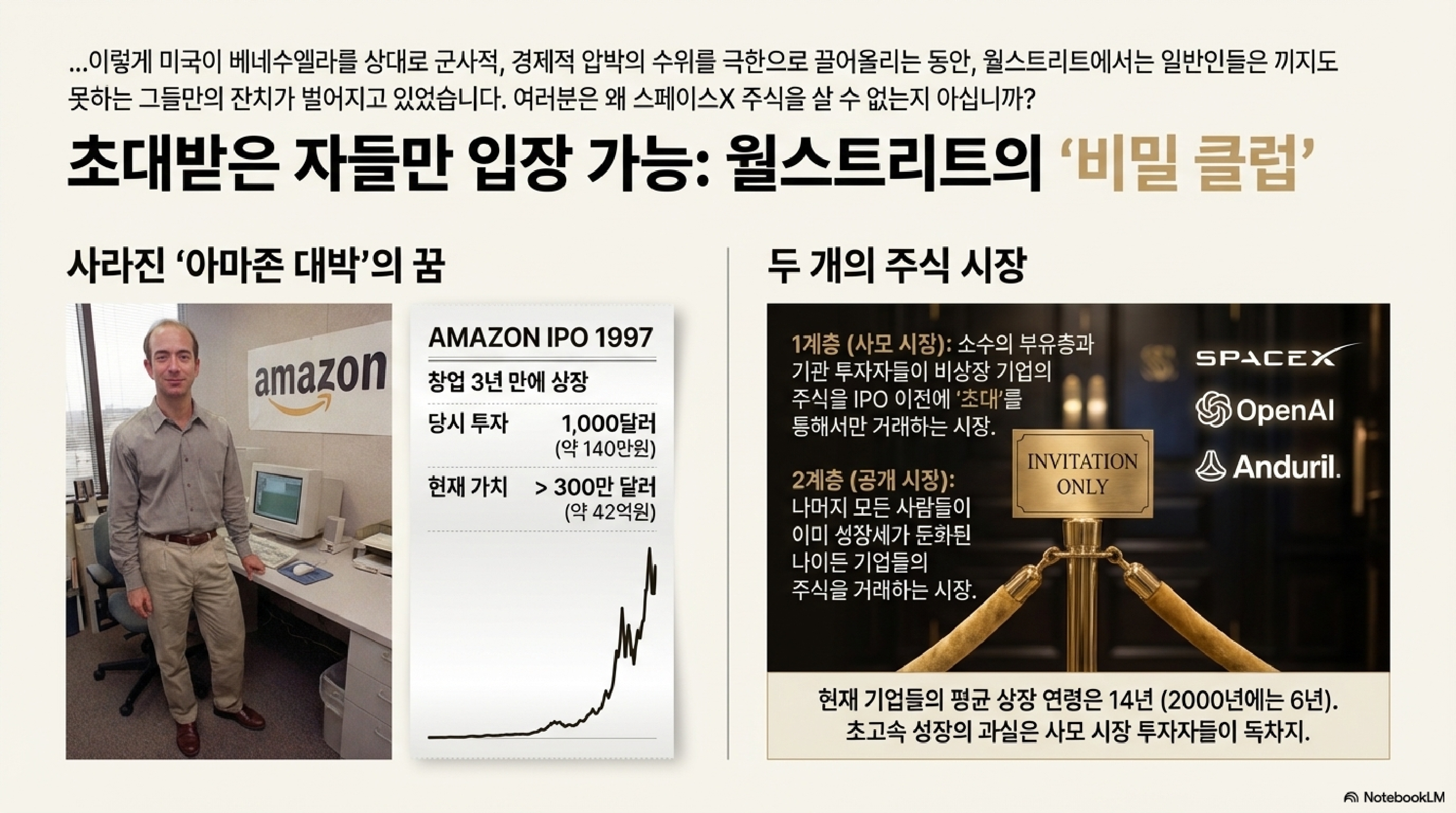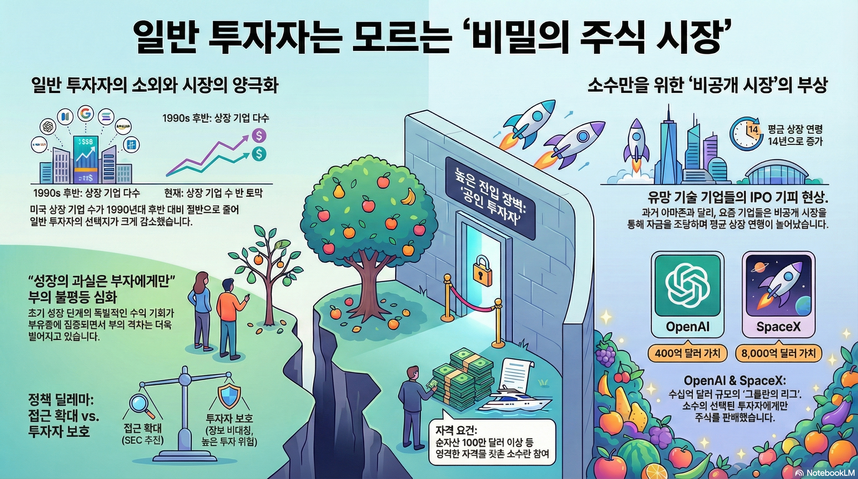 이 현상은 부의 불평등을 극단적으로 심화시킵니다. 과거 아마존 같은 기업들이 초기에 상장해 일반 투자자들도 성장의 과실을 함께 나눌 수 있었지만, 이제는 모든 성장이 끝난 뒤에야 시장에 나오는 경우가 허다합니다.