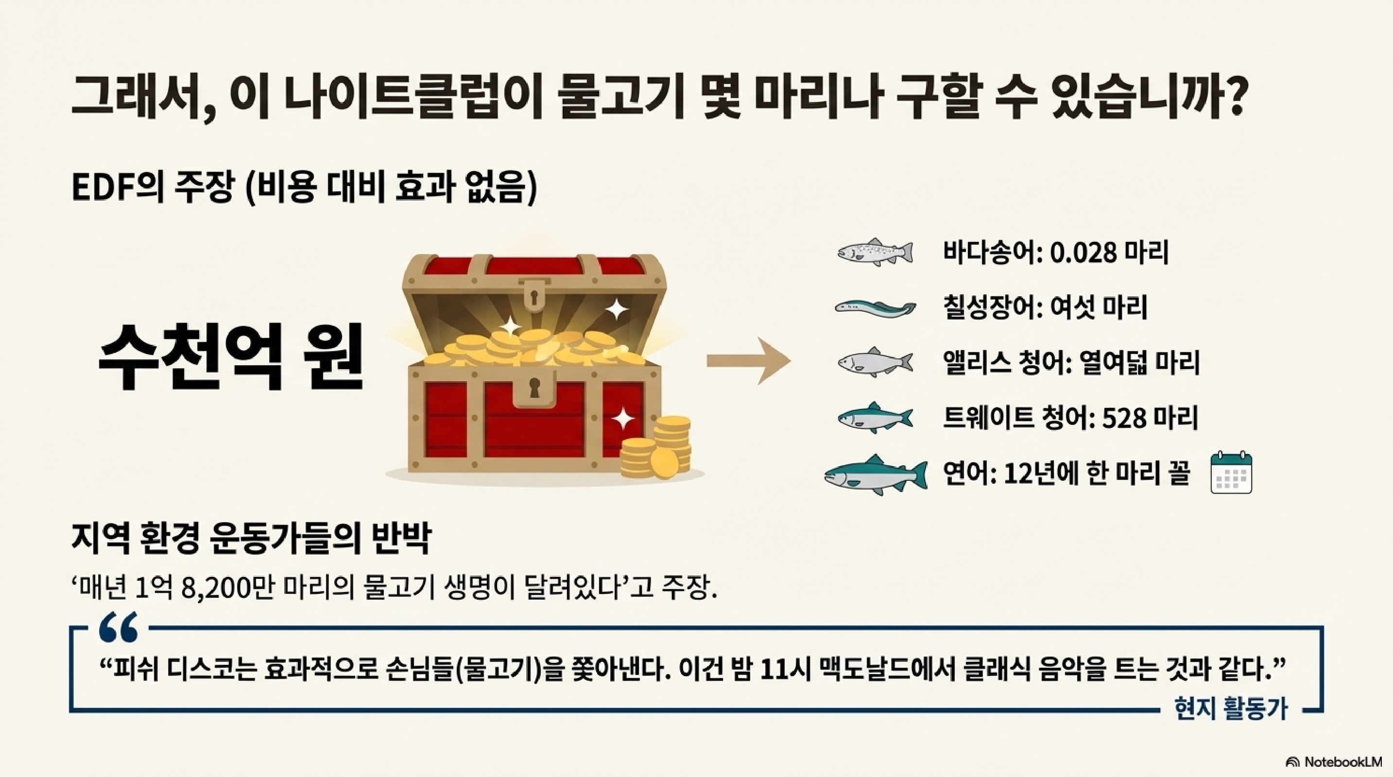 - 비용: 이 '피쉬 디스코'를 설치하고 유지 보수하는 데에만 수천만 달러, 즉 수백억 원이 추가로 들어갑니다.
