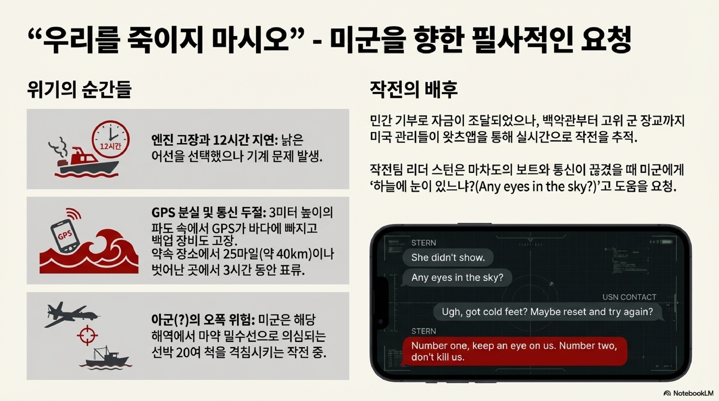 - 극적인 구출: 약속된 장소에 나타나지 않자, 구출팀은 비상이 걸렸습니다. 미국인 참전용사 브라이언 스턴이 이끄는 팀은 위험한 바다를 수색한 끝에 마침내 마차도를 발견하고 구조에 성공합니다.