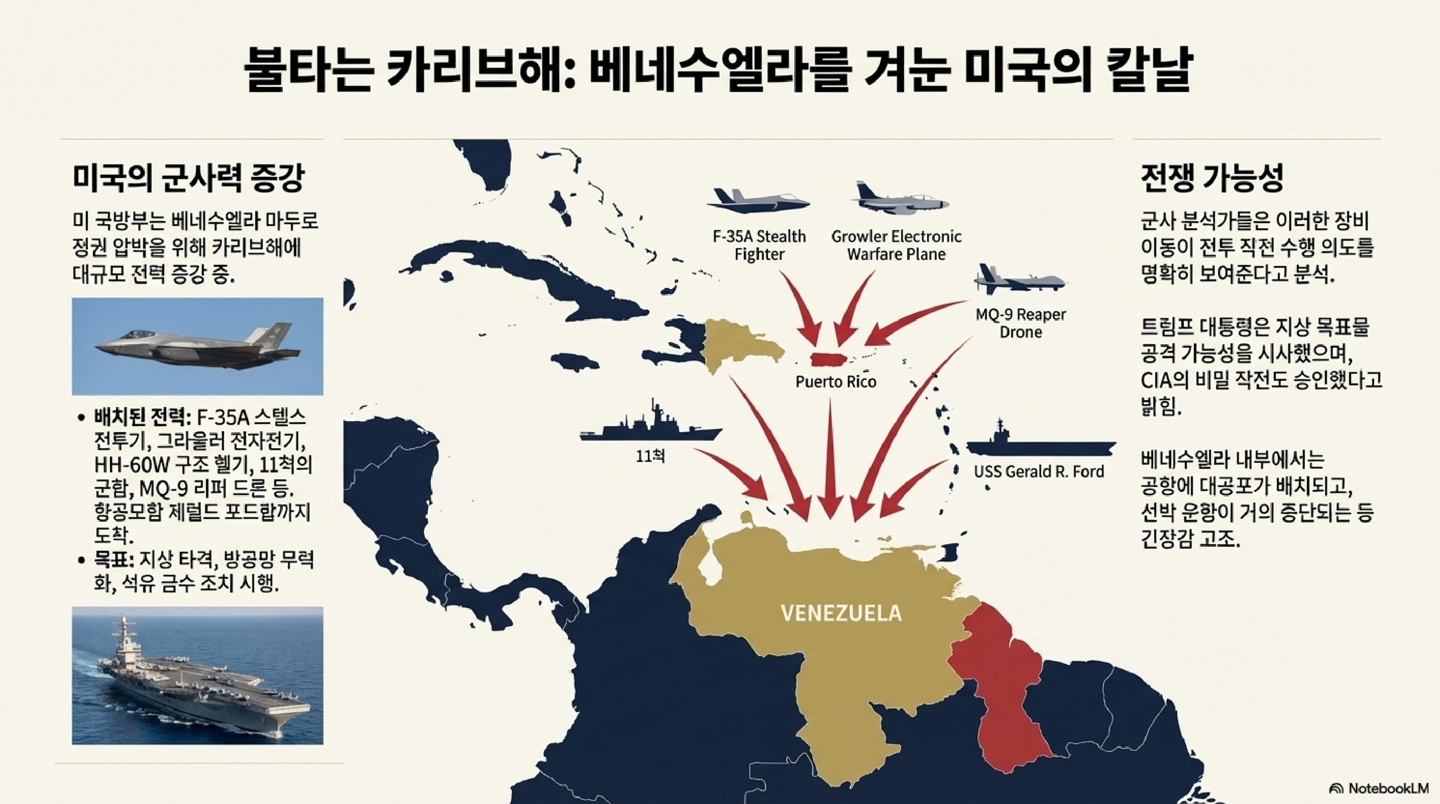군사 전문가들은 이 정도의 전력 증강이 전면적인 침공보다는 베네수엘라의 방공망을 무력화하고 정밀 타격을 가하는 데 최적화되어 있다고 분석합니다. 즉, 언제든 군사 행동에 나설 수 있다는 강력한 경고인 셈이죠.
