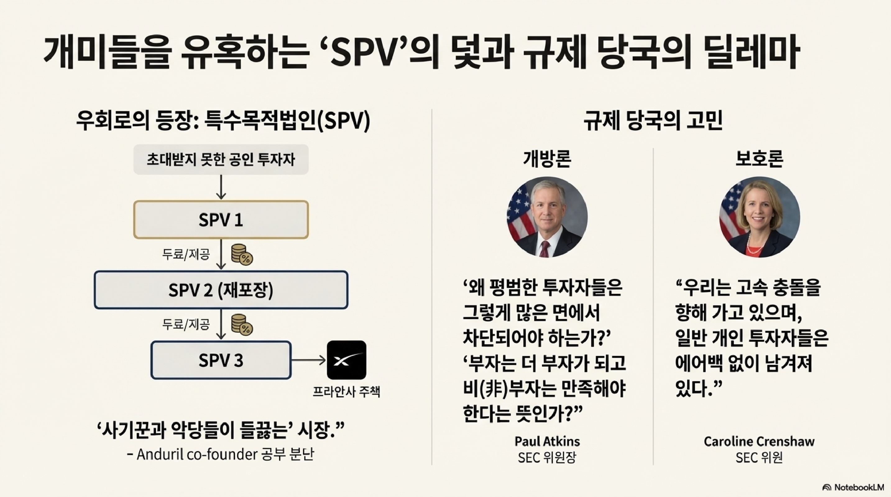 이 '초대 전용(invite-only)' 시장은 어떻게 작동할까요? 바로 '적격 투자자(accredited investor)' 제도와 '특수목적법인(SPV)'이라는 장치를 통해서입니다. 순자산 100만 달러(약 14억 원) 이상이거나 연 소득 20만 달러(약 2억 8,000만 원) 이상인 사람만 참여 자격이 주어집니다. 마치 인기 가수의 콘서트 티켓을 팬클럽 VVIP에게만 먼저 파는 것과 같습니다. 심지어 이 VVIP들도 직접 주식을 사는 게 아니라, 주식을 담아놓은 SPV라는 바구니를 사는 방식으로 거래가 이뤄지기도 합니다.