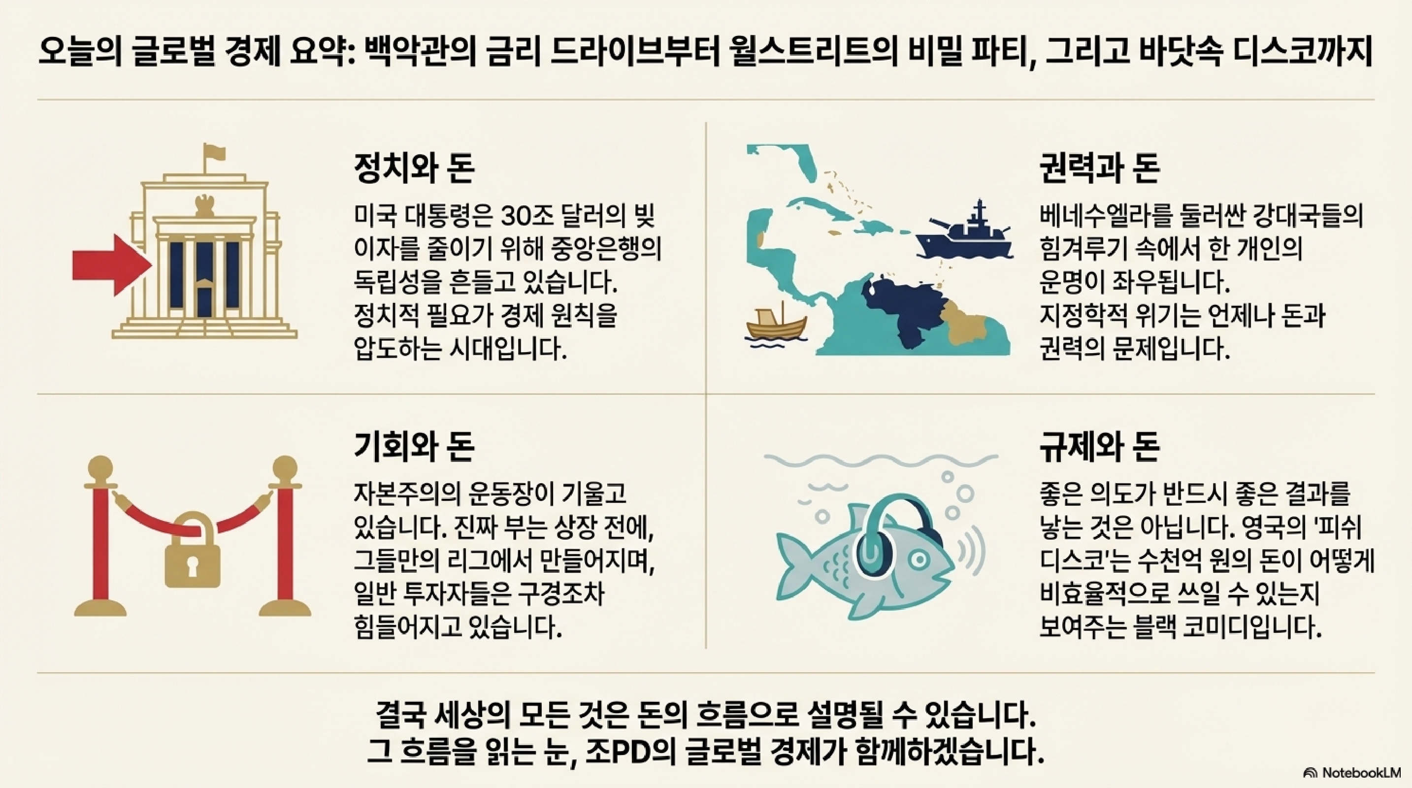 자, 오늘 네 가지 이야기를 돌아볼까요? 베네수엘라의 정치 스릴러가 우리의 주유비를 결정하고, 트럼프 대통령의 말 한마디가 세계 금융 시장을 흔듭니다. 영국에서는 물고기를 위해 85조 원짜리 디스코 파티가 열리고, 월스트리트의 VIP 룸에서는 우리만 빼고 모두가 돈을 버는 비밀 파티가 한창입니다.