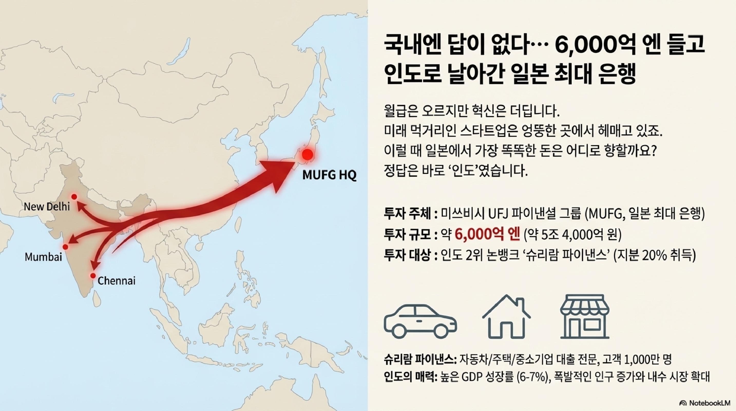 투자 대상은 인도의 2위 비은행 금융회사인 '슈리람 파이낸스'입니다. 자동차 대출, 주택 대출 등 개인과 중소기업 금융에 특화된 회사죠. MUFG는 이 회사의 지분 20%를 인수해, 성장하는 인도 내수 시장을 정조준하겠다는 야심을 드러냈습니다.