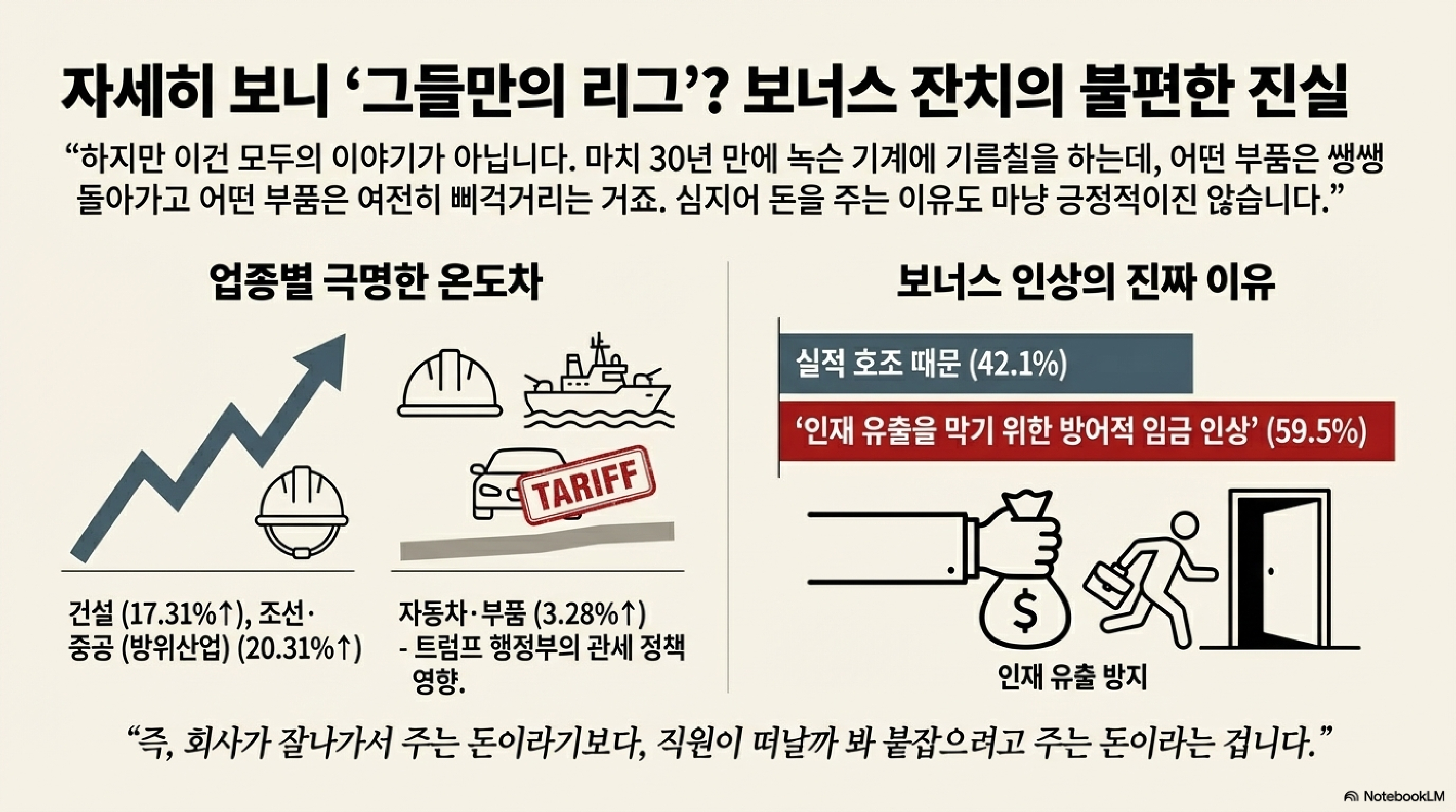 여기서 우리가 주목해야 할 또 다른 포인트가 있습니다. 바로 '인재 유출을 막기 위한 방어적 임금 인상'의 영향입니다. 이번 조사에서 실적에 따라 보너스가 바뀌는 기업(4.96% 증가)보다, 실적과 상관없이 지급하는 기업(8.08% 증가)의 보너스 증가율이 훨씬 높았습니다.