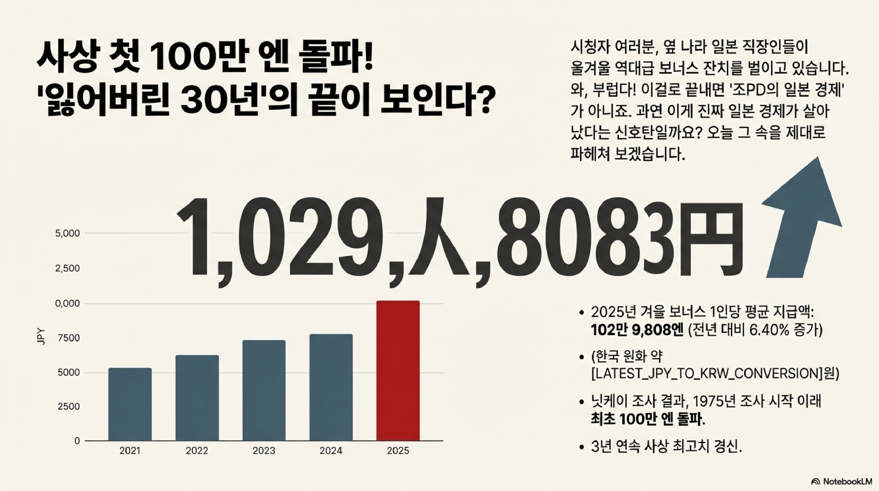 첫 번째 소식입니다. 일본이 지금 '보너스 잔치'로 떠들썩합니다. 일본 기업들의 올겨울 1인당 보너스가 사상 처음으로 100만 엔, 우리 돈으로 약 900만 원을 돌파했습니다. 이게 단순히 "월급이 좀 올랐네" 수준의 이야기가 아닙니다. 일본 경제의 구조적 변화와 얼어붙었던 소비 심리가 드디어 녹아내릴지 모른다는 중요한 신호탄이기 때문이죠.