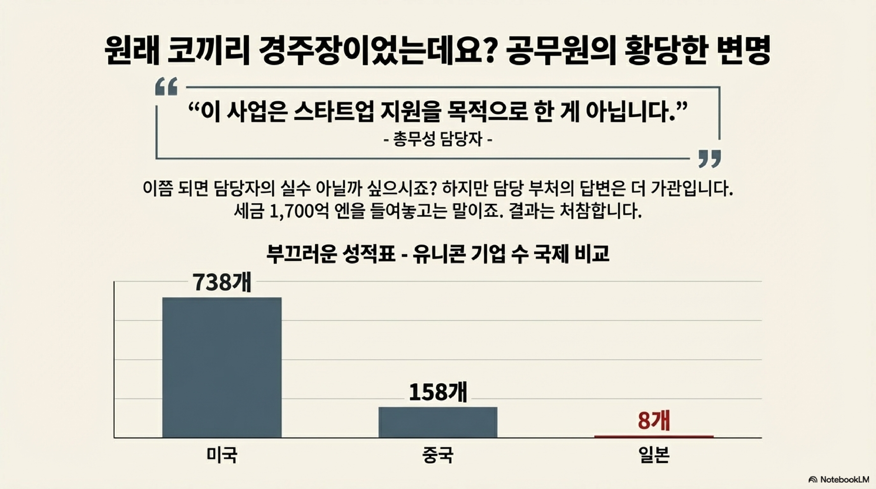 일본 정부가 차세대 구글, 아마존 같은 '유니콘 기업'을 키우겠다며 야심 차게 시작한 스타트업 보조금 정책. 그런데 알고 보니 이 돈의 20%가 대기업의 배를 불리는 데 쓰였다는 충격적인 사실이 드러났습니다. 이건 단순한 예산 낭비가 아닙니다. 일본의 혁신 성장 전략이 왜 헛바퀴만 돌고 있는지를 보여주는 단적인 사례입니다.