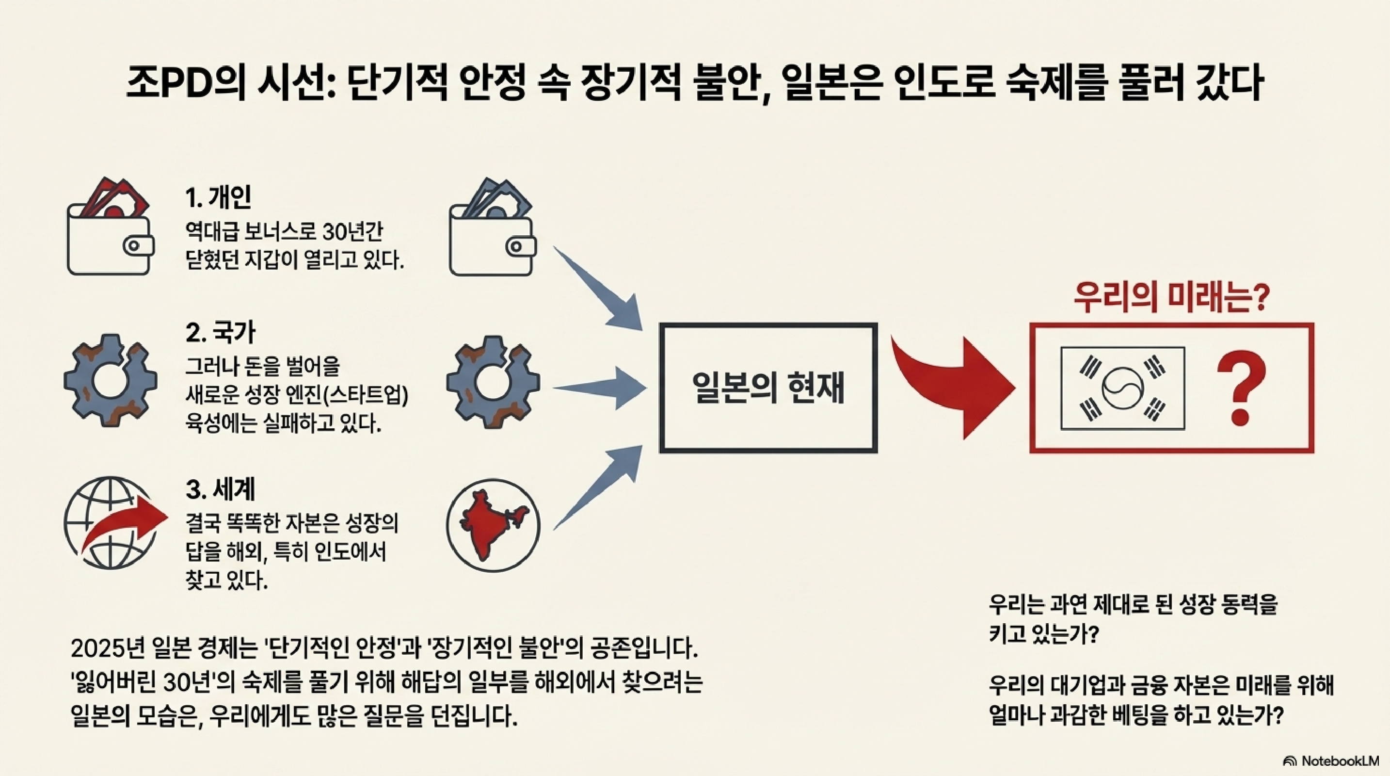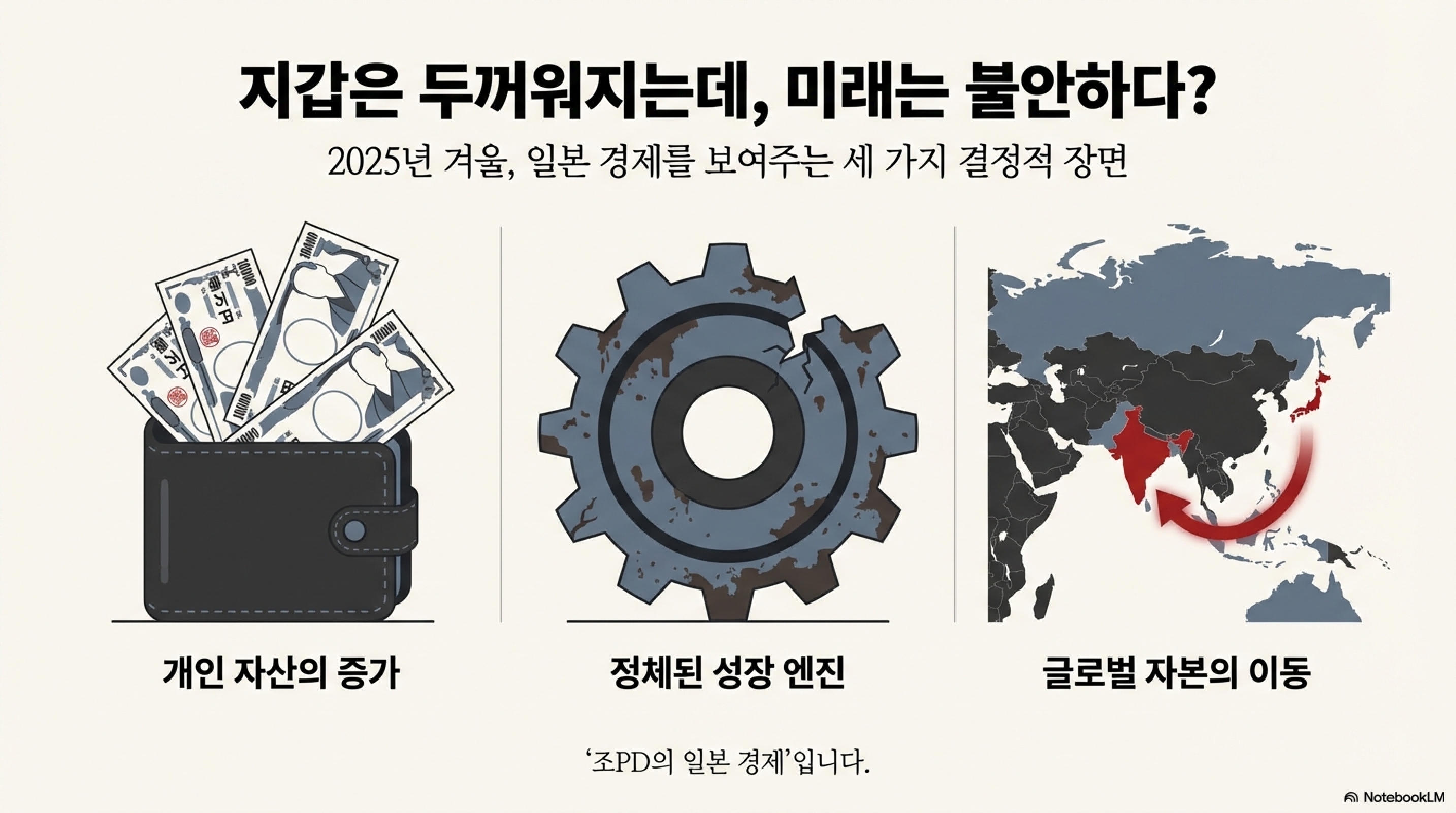 역대급 보너스 잔치 속에서도 산업별 희비가 엇갈리고, 잠자던 기업 사냥꾼이 경영진을 흔들고 있습니다. 미래를 위한 스타트업 정책은 엉뚱한 곳으로 새어 나가는데, 그 사이 일본의 거대 금융 자본은 인도를 향해 조 단위 베팅을 하고 있습니다. 겉보기엔 조용하지만 속으로는 국내의 정체와 해외로의 확장이 동시에 벌어지는 엄청난 지각변동이 일어나고 있는 겁니다.