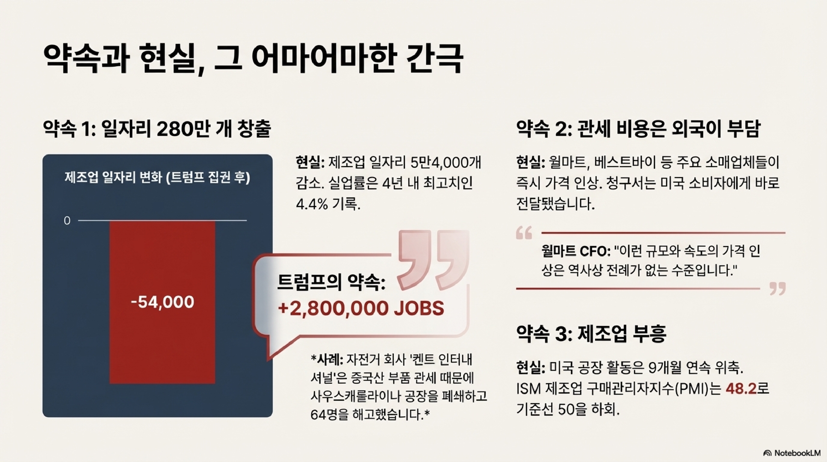 - 현실: 이 정책의 가장 큰 실패 지점입니다. 미국 공장 활동은 9개월 연속 위축됐습니다.