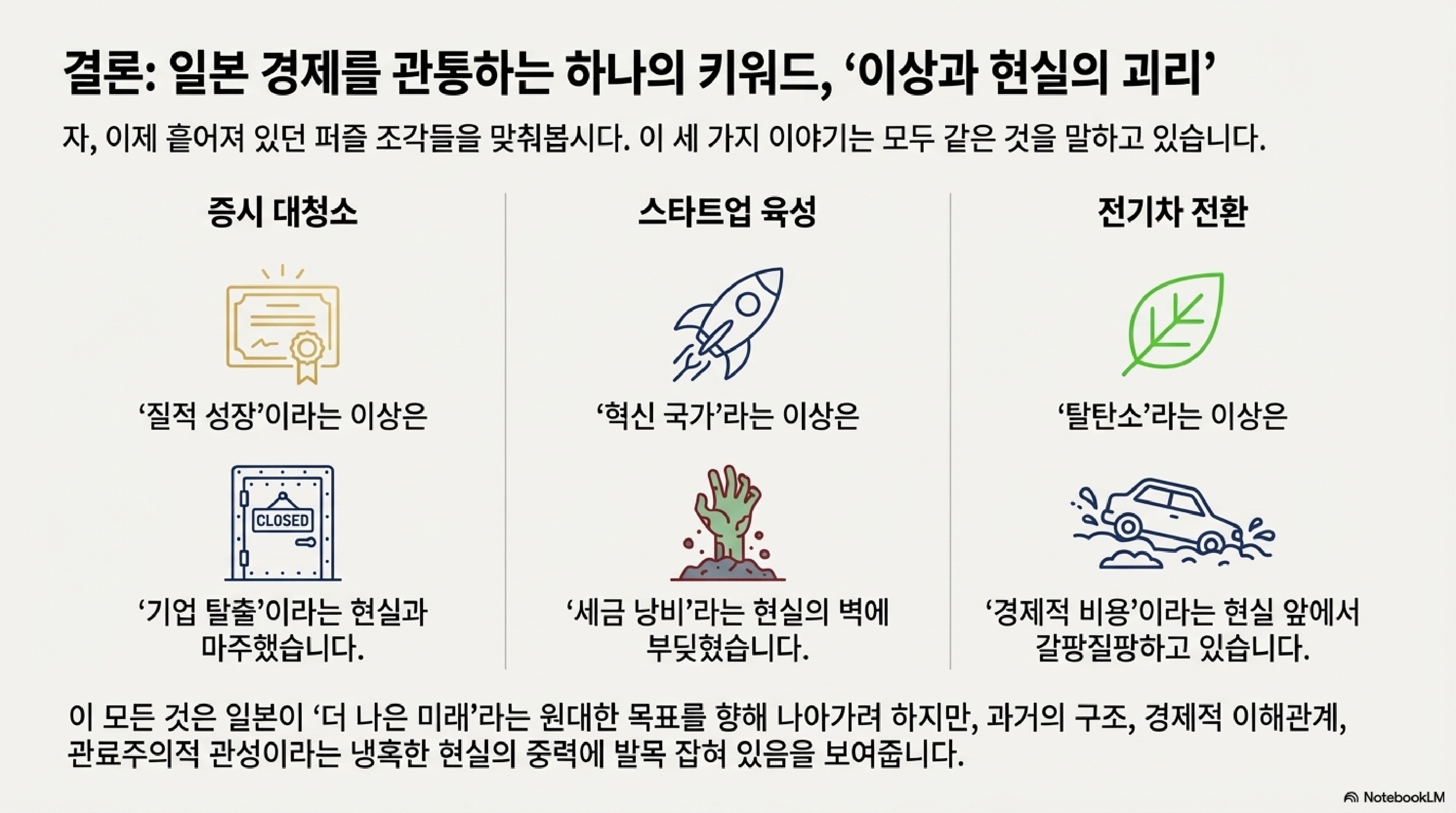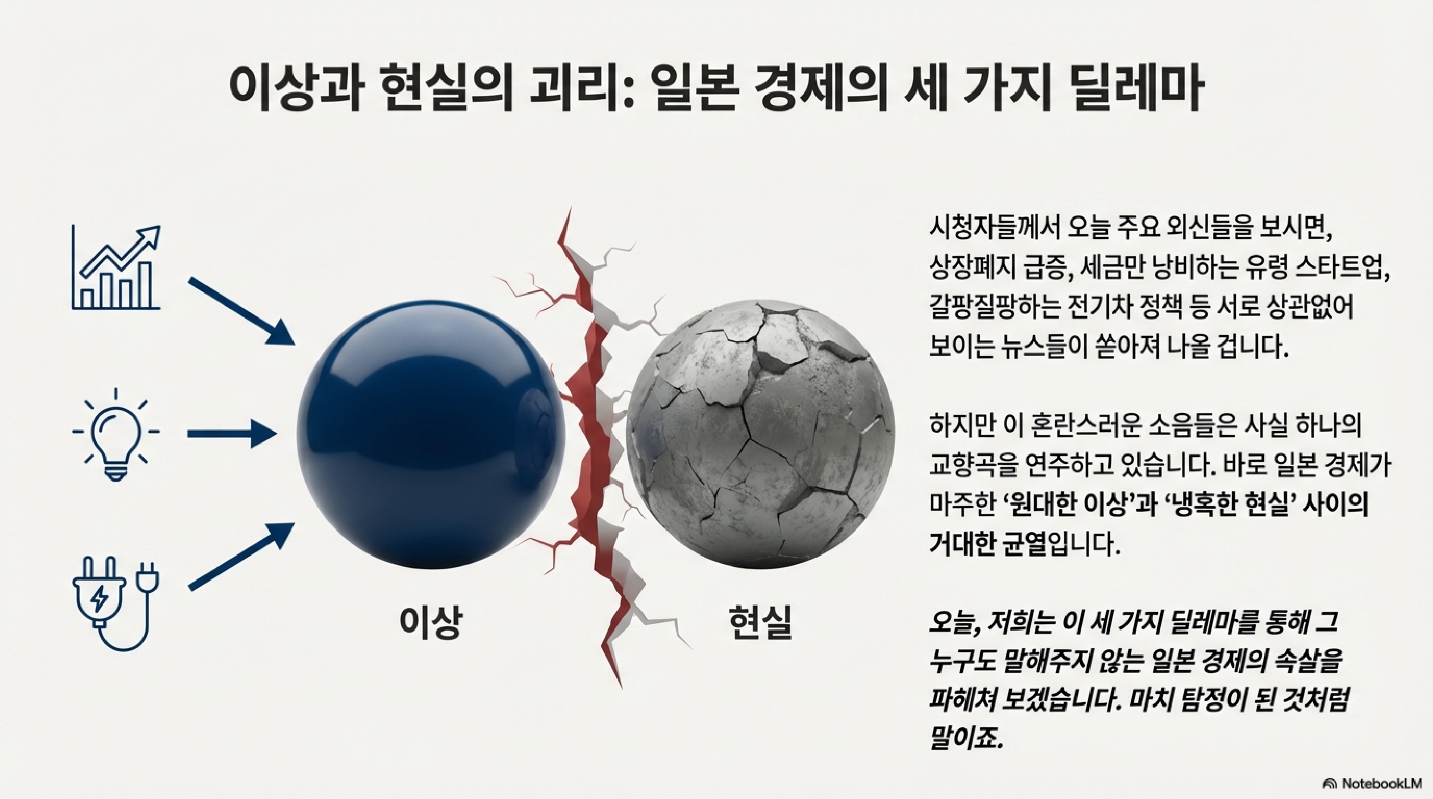 여러분, 세상이 참 요지경입니다. 오늘은 잘나가던 대기업은 증시에서 도망치고, 정부가 밀어주는 새싹 기업은 사실 싹이 아닌 무늬만 스타트업이고, 모두가 믿었던 전기차의 미래에는 세금 청구서가 날아온다는, 조금은 황당한 일본 경제의 이면을 파헤쳐 보겠습니다. 얼핏 보면 뒤죽박죽인 것 같지만, 이 세 가지 이야기 속에는 일본 경제의 거대한 성장통이 숨어있습니다.