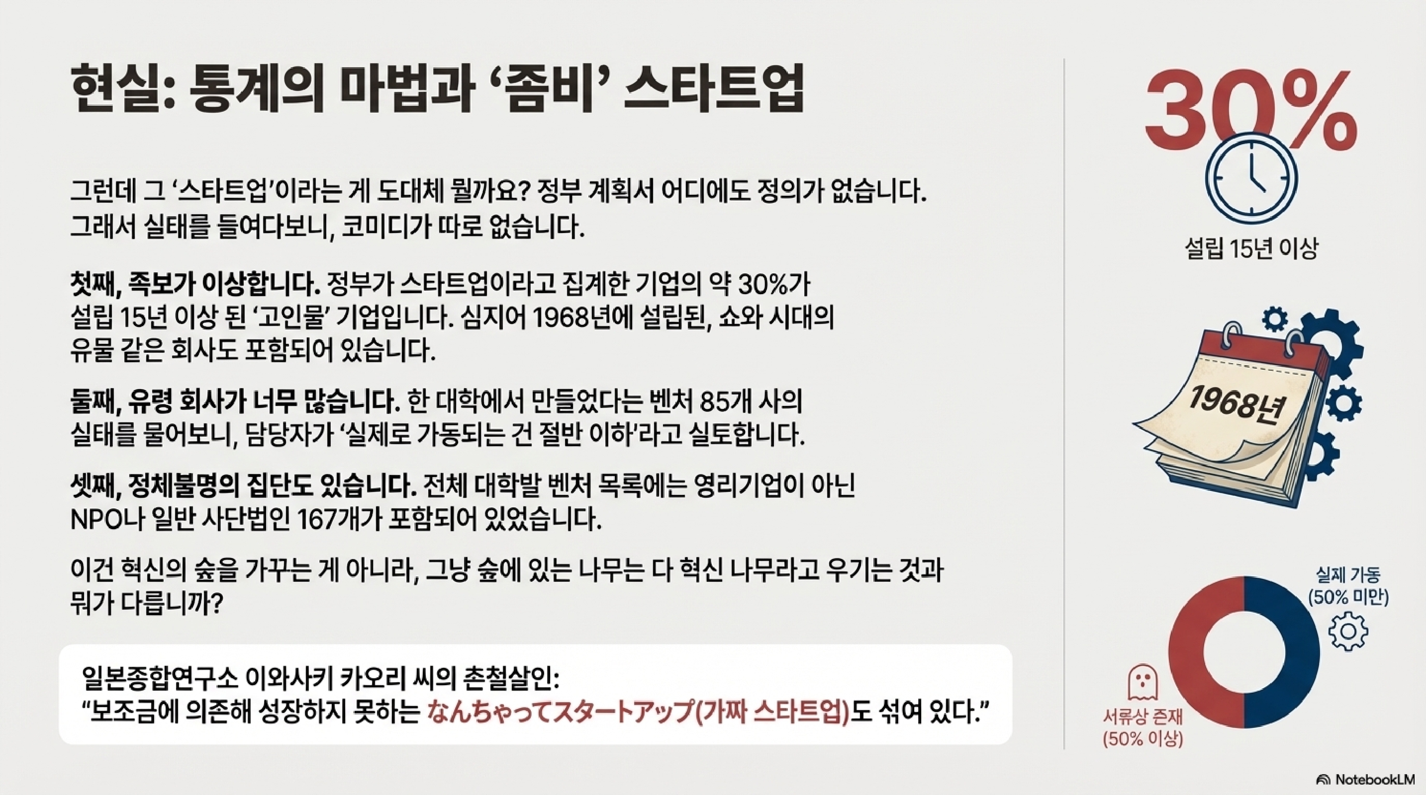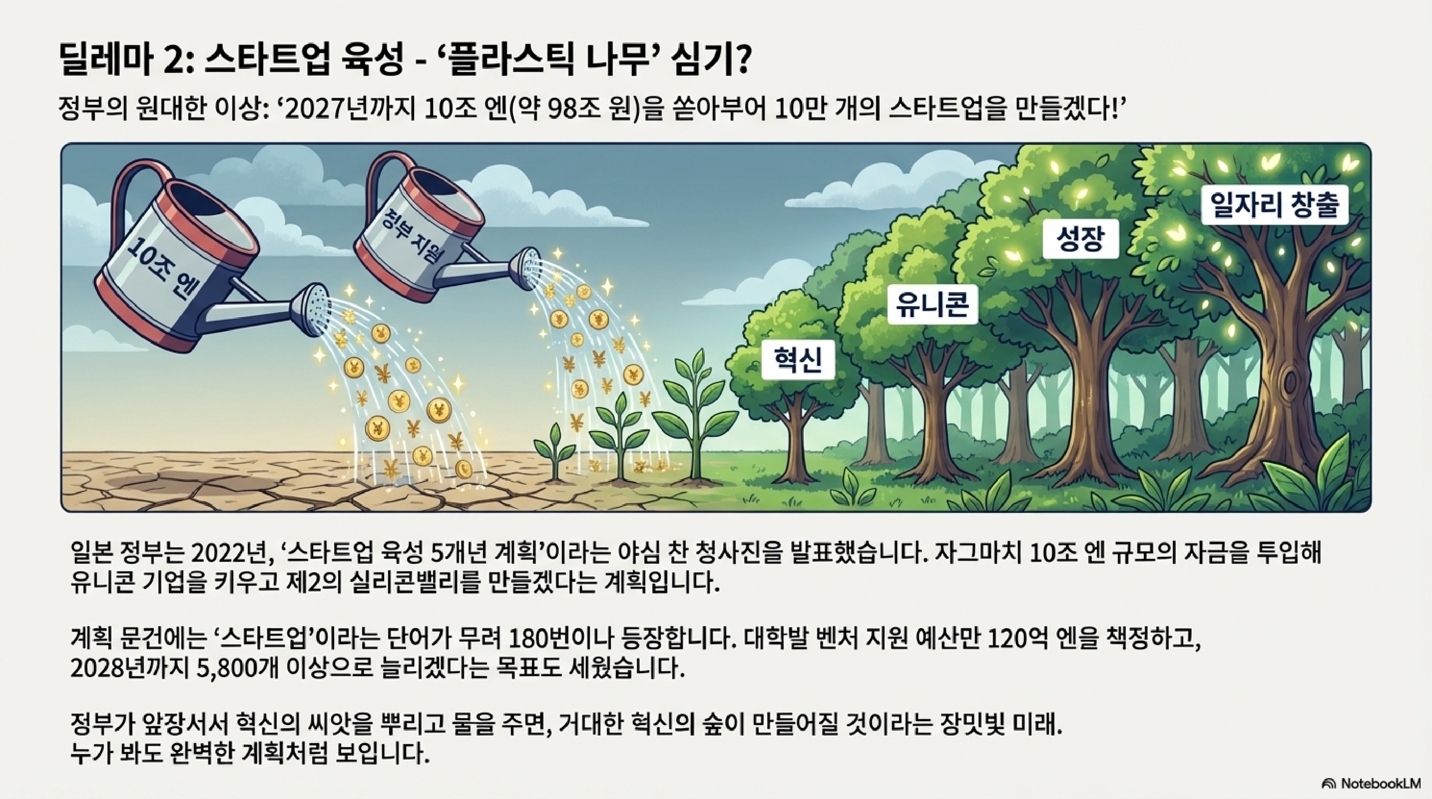 일본 정부는 '스타트업 육성 5개년 계획'이라는 야심 찬 청사진을 내걸었습니다. 2022년 이후 무려 1조 5천억 엔(약 14조 원)이 넘는 막대한 예산을 쏟아붓고 있죠. 그런데 문제가 있습니다. 정부 공식 문서에 '스타트업'이라는 단어가 180번이나 나오지만, 정작 '스타트업이 무엇인지'에 대한 정의가 없습니다. 이러다 보니 정책의 효과를 제대로 측정할 수 없는 코미디 같은 상황이 벌어지고 있습니다. 과연 일본은 진짜 유니콘을 키우는 것일까, 아니면 보조금만 노리는 '가짜' 스타트업을 양산하는 것일까?