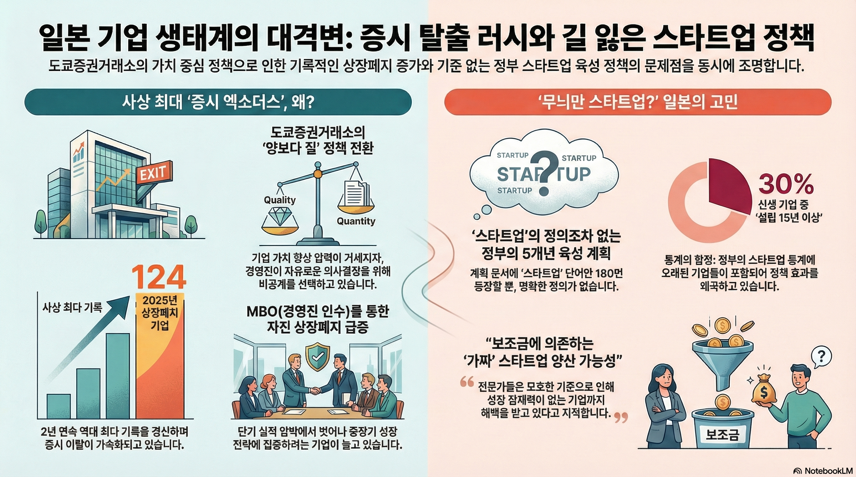 오늘은 일본 경제의 세 가지 단면을 살펴봤습니다. 효율성을 찾아 증시를 떠나는 '대탈출' 시대의 기업들, 정의조차 모호한 채 혈세가 투입되는 '무늬만 스타트업' 논란, 그리고 모두가 믿었던 '전기차 대세론'에 나타난 균열까지.