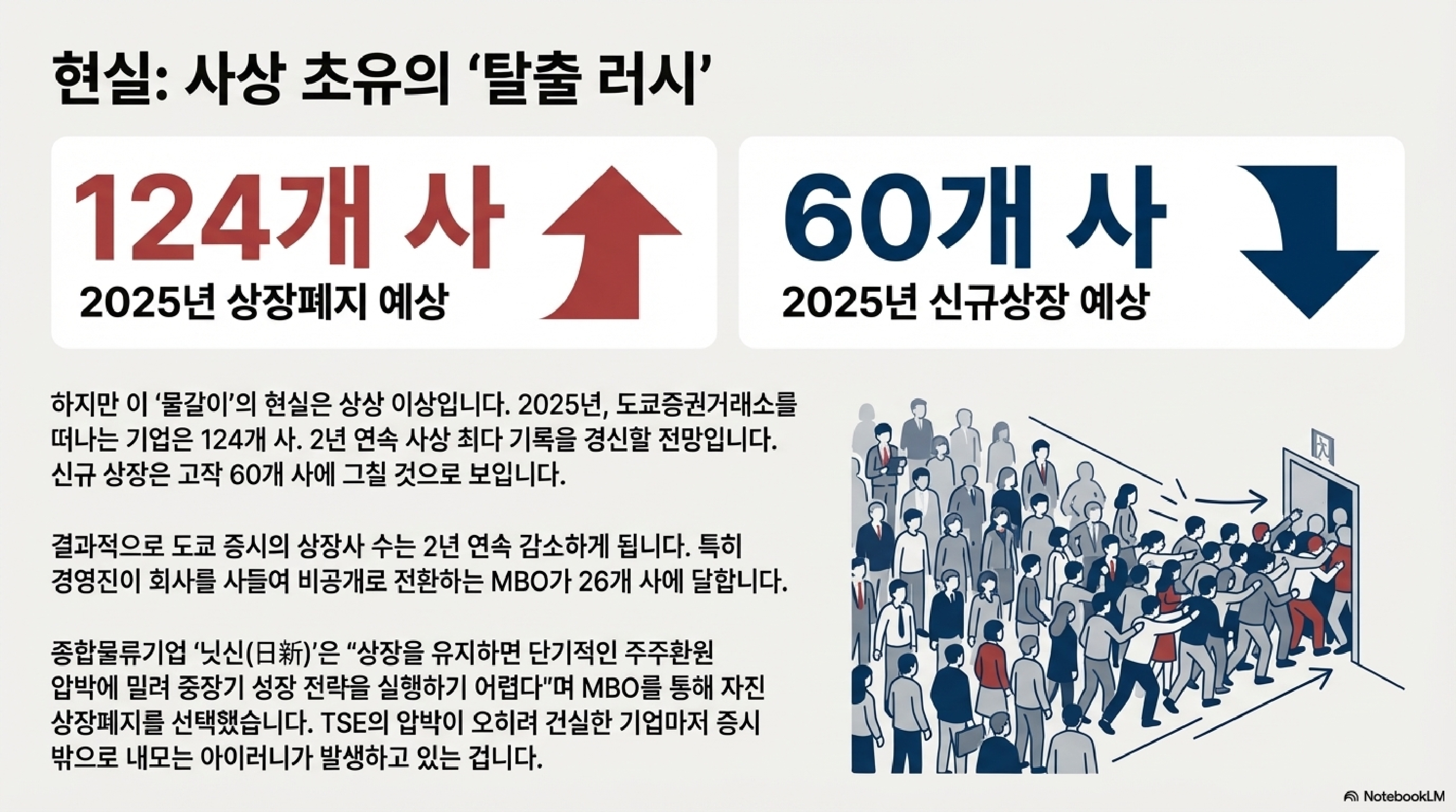 기업공개(IPO), 즉 주식 시장에 이름을 올리는 것은 모든 기업의 꿈이라고들 합니다. 그런데 요즘 일본에서는 정반대의 현상이 벌어지고 있습니다. 마치 약속이라도 한 듯, 수많은 기업들이 증시를 떠나는 '대탈출'을 감행하고 있습니다. 2025년 한 해에만 무려 124개 기업이 도쿄증권거래소에서 상장 폐지를 결정했습니다. 이는 2024년보다 30개나 많은 수치로, 2년 연속 사상 최다 기록을 갈아치운 것입니다. 바야흐로 ‘도쿄증시 대탈출 시대’가 열린 셈입니다. 도대체 왜 이런 일이 벌어지고 있는 걸까요?