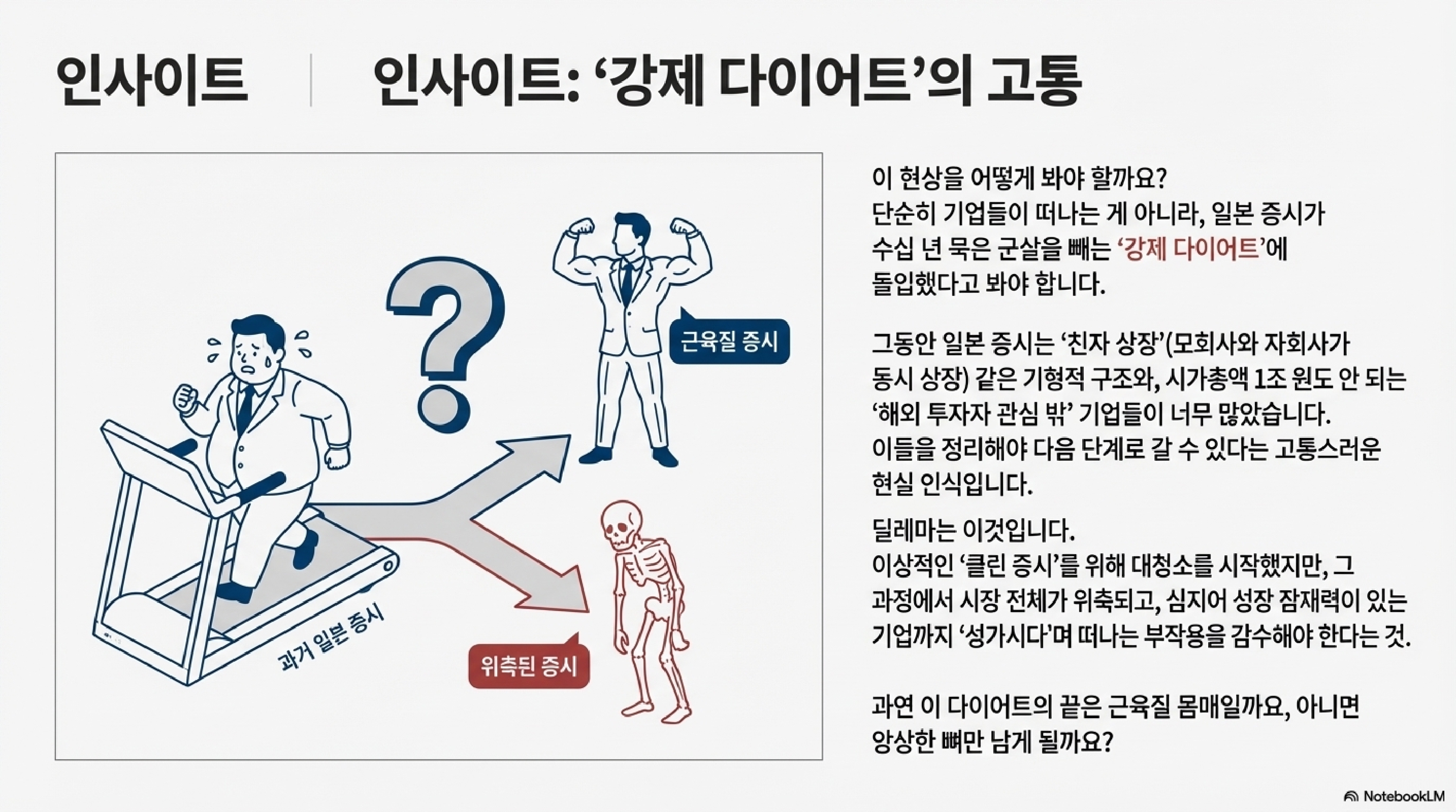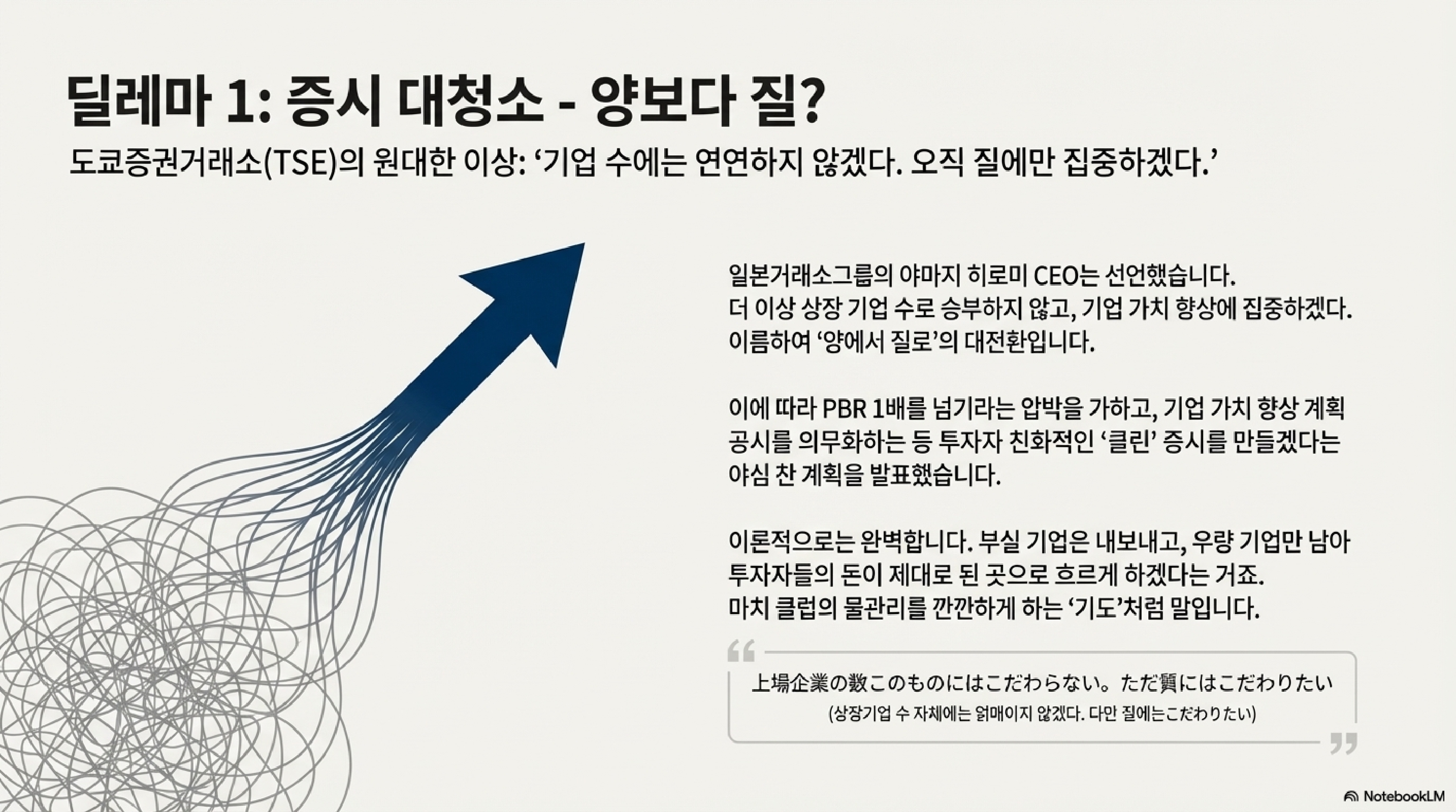 첫째, 도쿄증권거래소(TSE)의 태도가 180도 바뀌었습니다. 과거에는 '양'을 중시하며 문턱을 낮췄다면, 이제는 '질'을 따지기 시작했습니다. 특히 주가순자산비율(PBR)이 1배를 넘도록 기업 가치를 끌어올리라는 압박을 노골적으로 하고 있죠. 비유하자면, 이제 아무나 받아주던 동네 맛집이 아니라, 미슐랭 스타를 목표로 깐깐하게 손님을 가려 받기 시작한 것과 같습니다. 기준에 미치지 못하는 기업들은 더 이상 버티기 힘들어졌습니다.