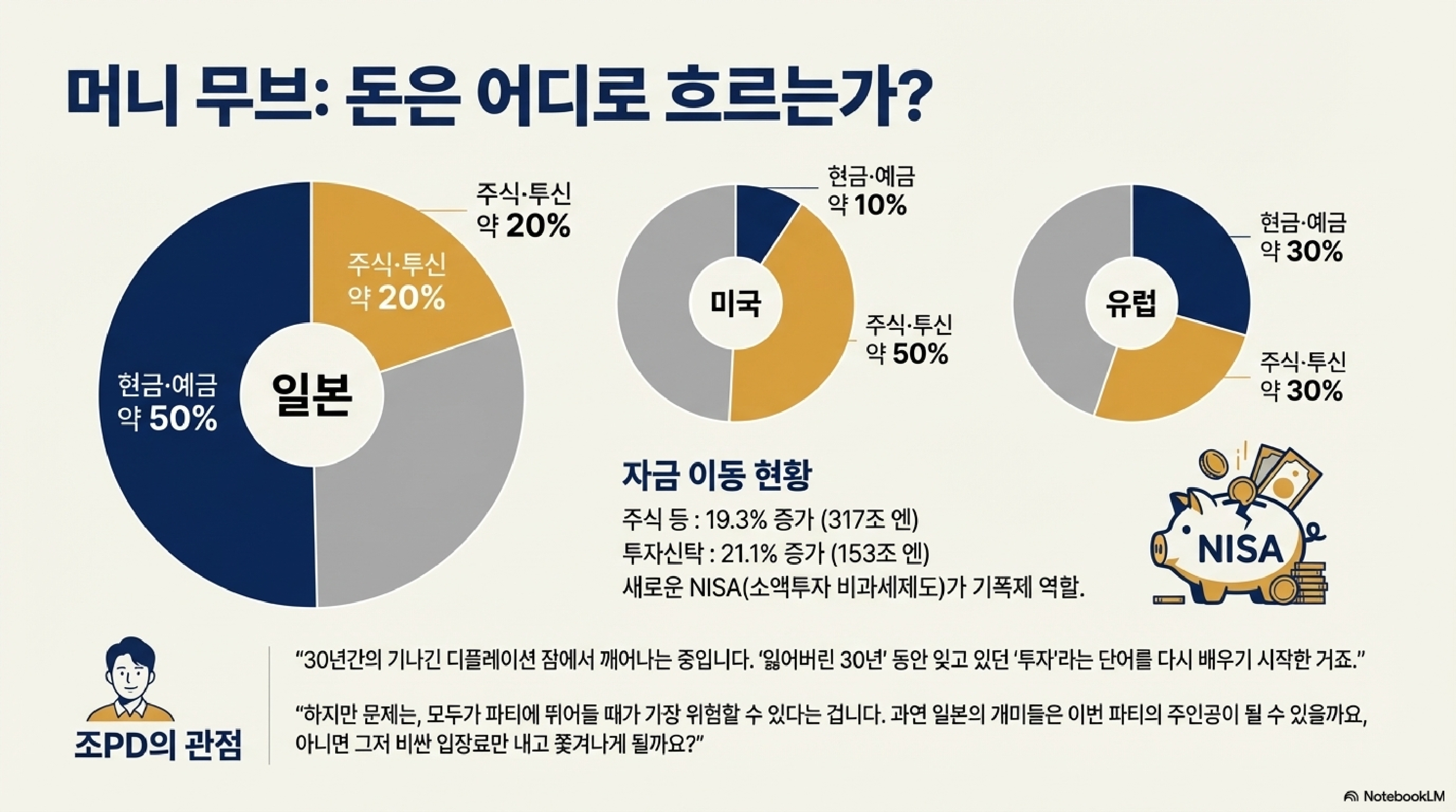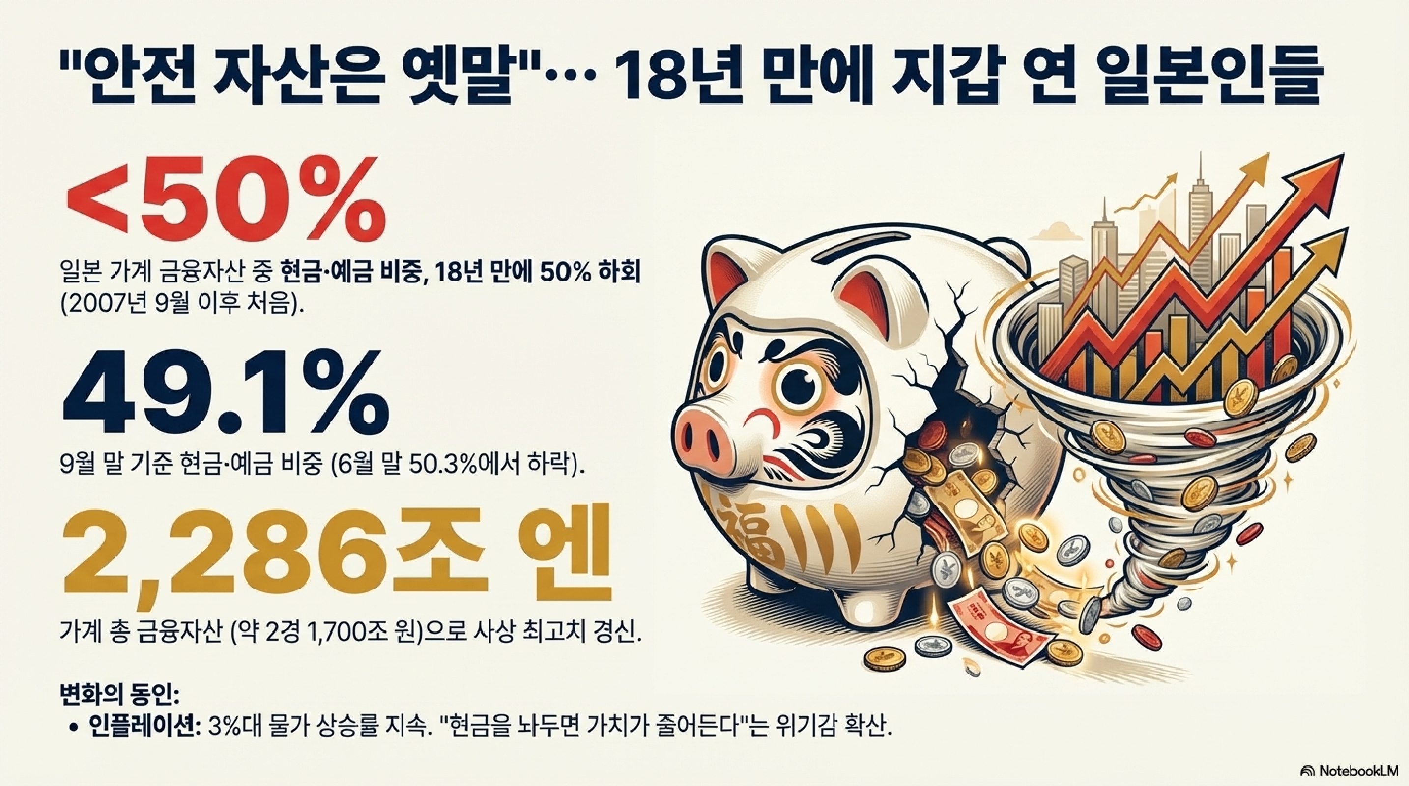 - 변화의 동력: 바로 끈질기게 이어지는 인플레이션입니다. 시청자 여러분, 쉽게 말해 은행에 돈을 넣어두면 가만히 앉아서 손해 보는 시대가 왔다는 걸, 일본인들이 드디어 깨닫기 시작한 겁니다.