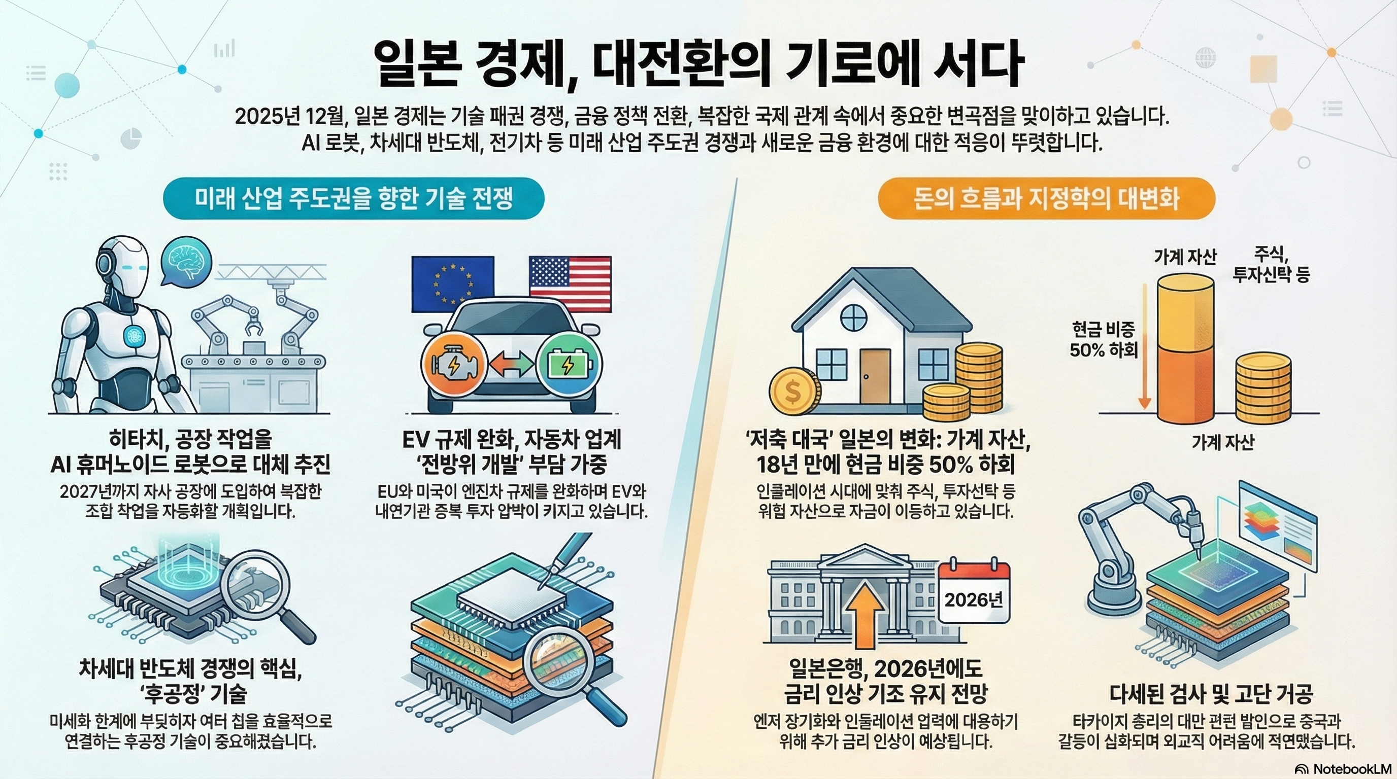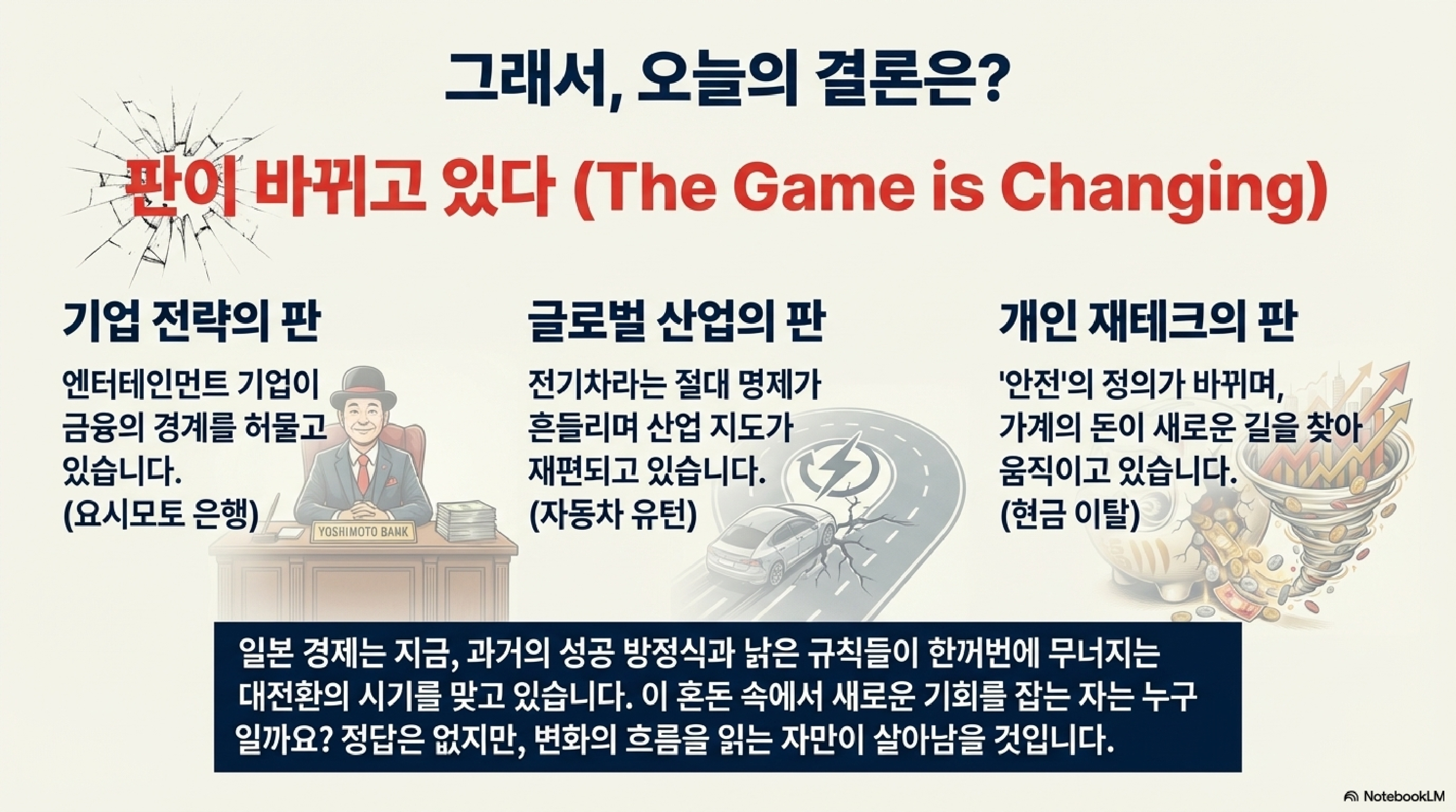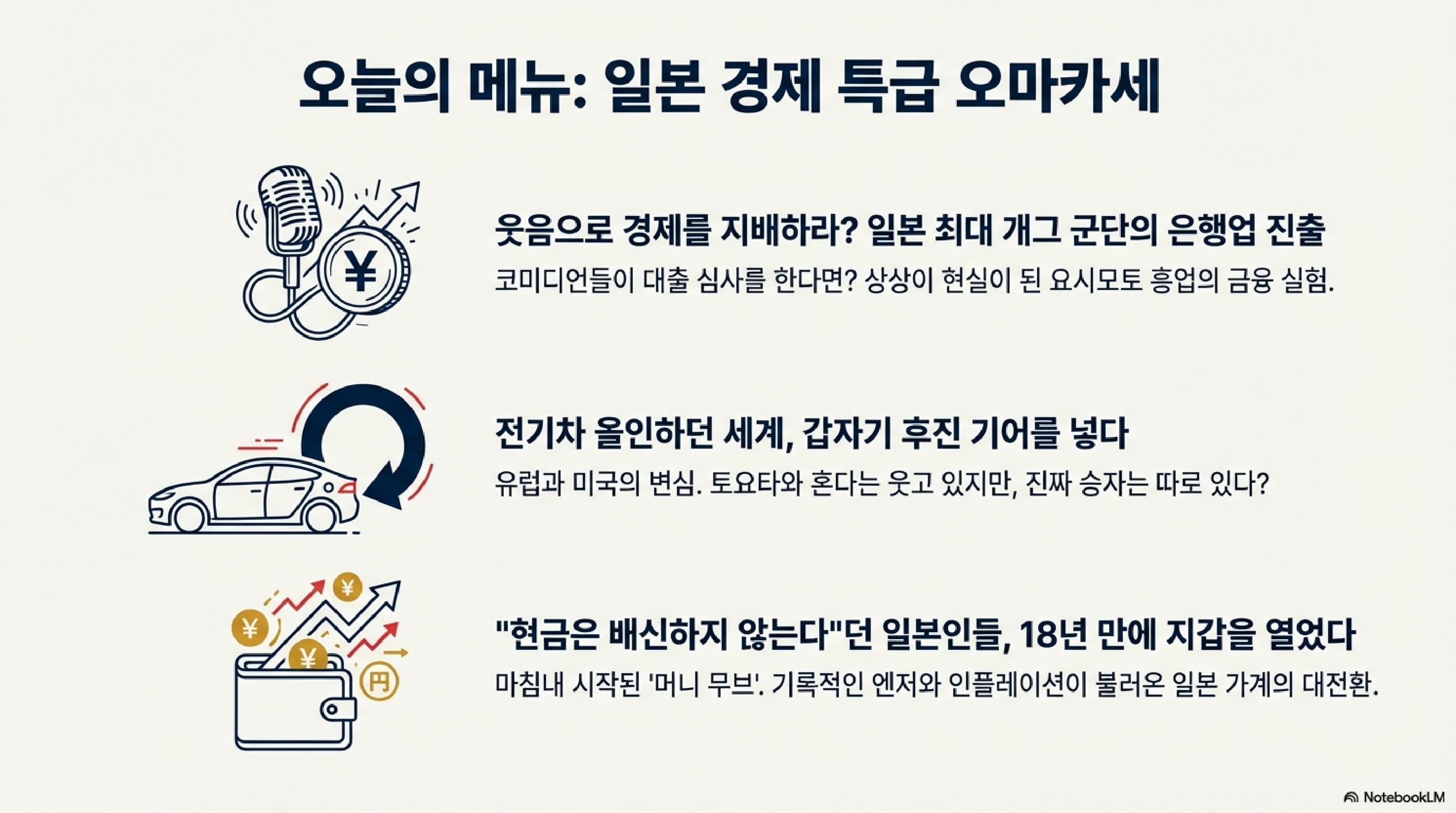오늘 일본에서는 공상과학이 현실이 됐습니다. 로봇 군단이 공장을 접수하는 동안, 각국 정부는 전기차 고속도로에서 갑자기 유턴을 하고 있습니다. 그 와중에 일본의 짠돌이들은 수십 년 묵힌 장롱예금을 깨기 시작했고, 이걸로는 부족했는지 이제는 개그맨들이 은행까지 차렸습니다. 정신 똑바로 차리지 않으면 따라가기 힘든, 그야말로 대격변의 현장입니다. 그럼, 바로 시작하겠습니다.