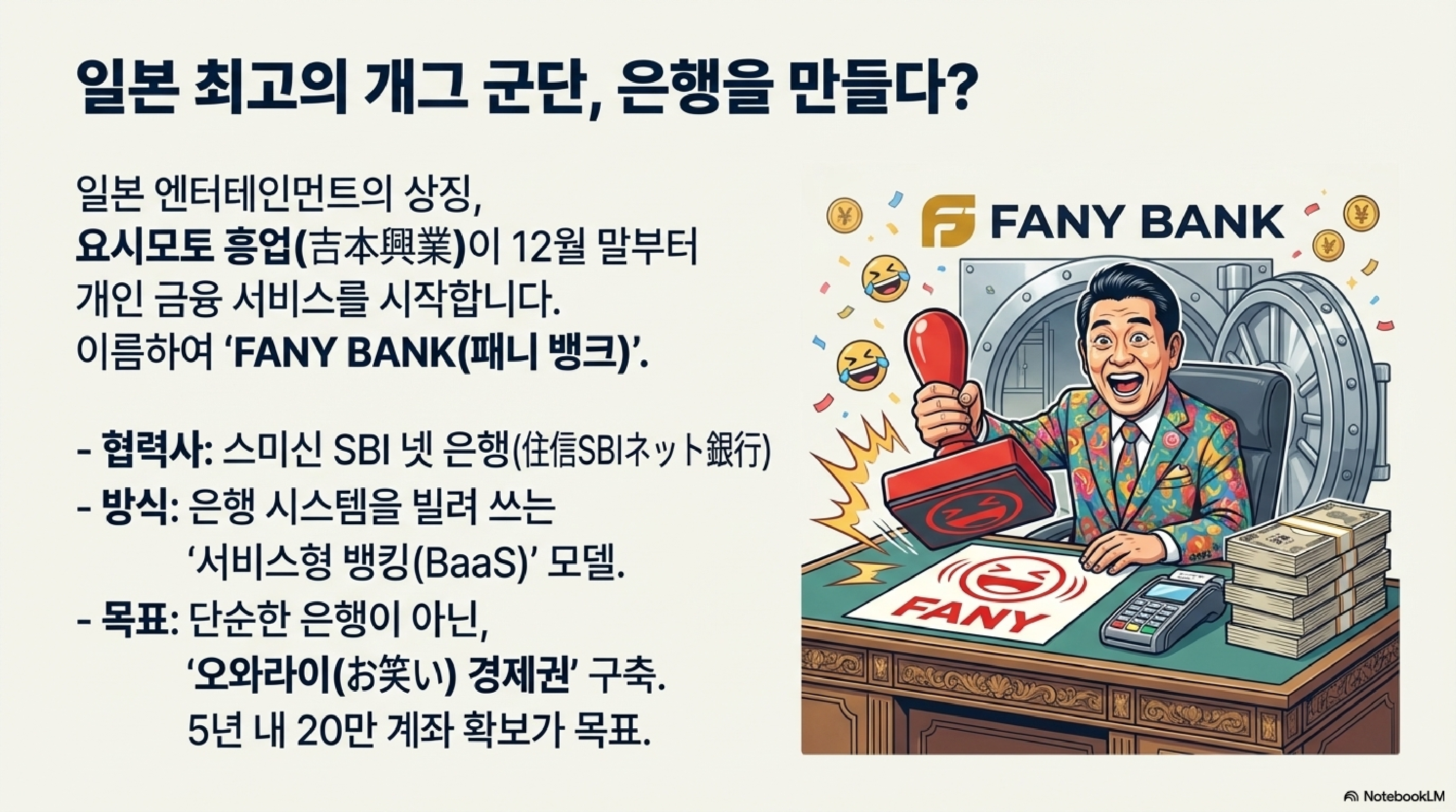 마지막 소식은 정말 황당하면서도 기발합니다. 일본 최대의 개그맨 기획사인 '요시모토 흥업'이 은행업에 진출한다고 합니다. "개그맨이 왜 은행을?" 싶으시겠지만, 이 이면에는 아주 치밀한 사업 전략이 숨어 있습니다. 이건 단순한 이벤트가 아니라, 'BaaS(서비스형 은행)'라는 최신 금융 트렌드를 활용해서 팬덤을 거대한 경제권으로 묶으려는 대담한 시도입니다.