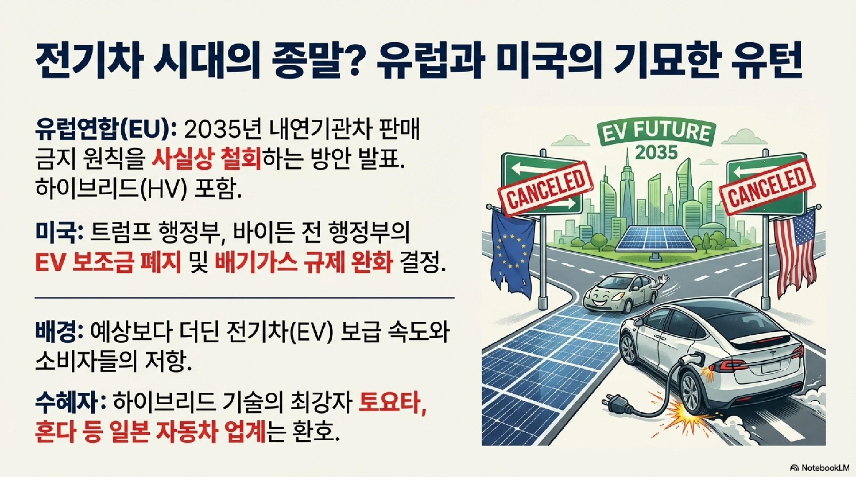 다음 소식은 자동차 업계 이야기입니다. 그동안 전 세계 정부들이 전기차로의 전환을 향해 채찍질을 해왔는데, 갑자기 급제동을 거는 모양새입니다. 세계 자동차 산업의 패러다임을 뒤흔드는 이 정책 변화의 이면에는 어떤 경제적, 정치적 현실이 숨어있는지 파헤쳐 보겠습니다.