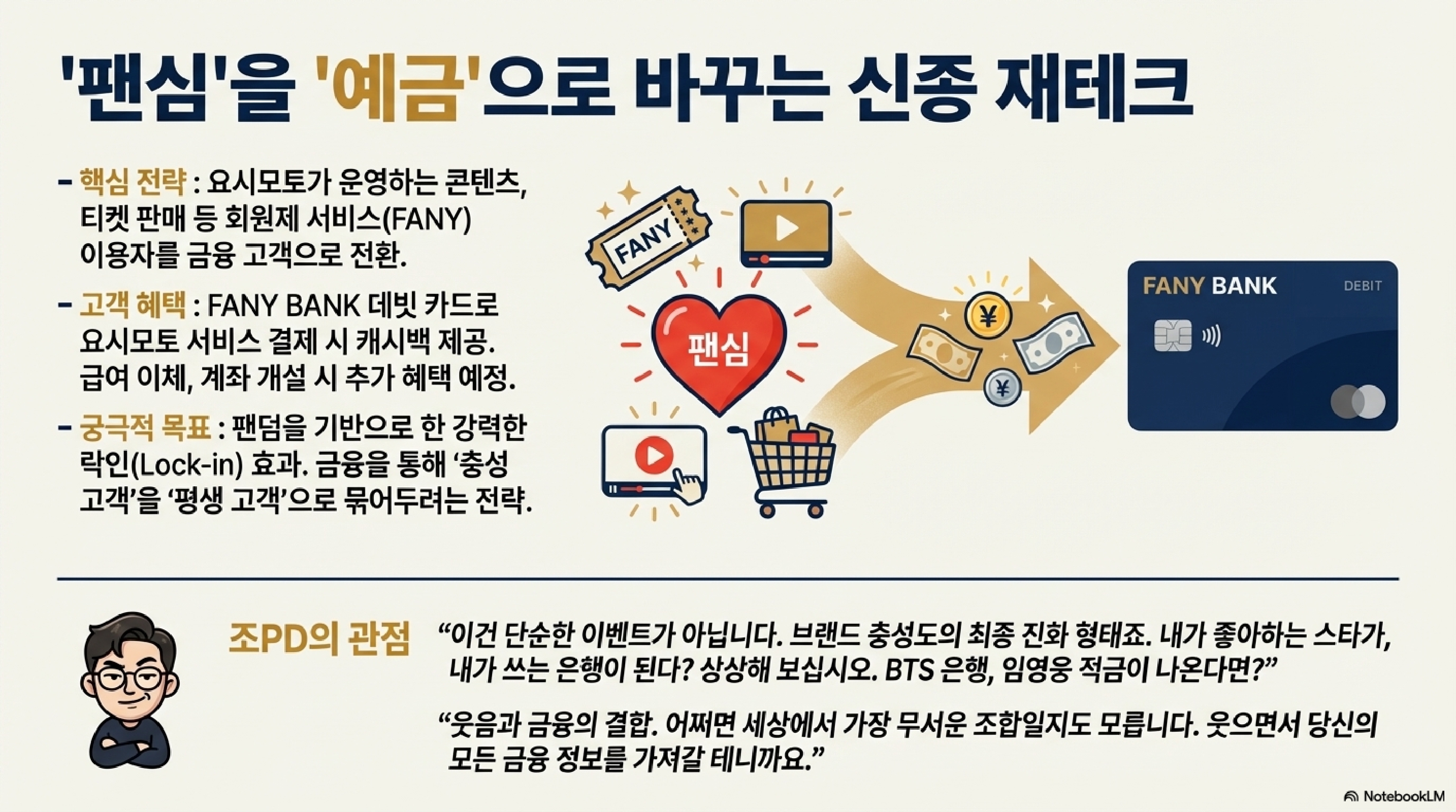 - 핵심 전략: 기존에 운영하던 콘텐츠 및 티켓 판매 회원제 서비스인 'FANY'와 은행 서비스를 완벽하게 연동시키는 겁니다.