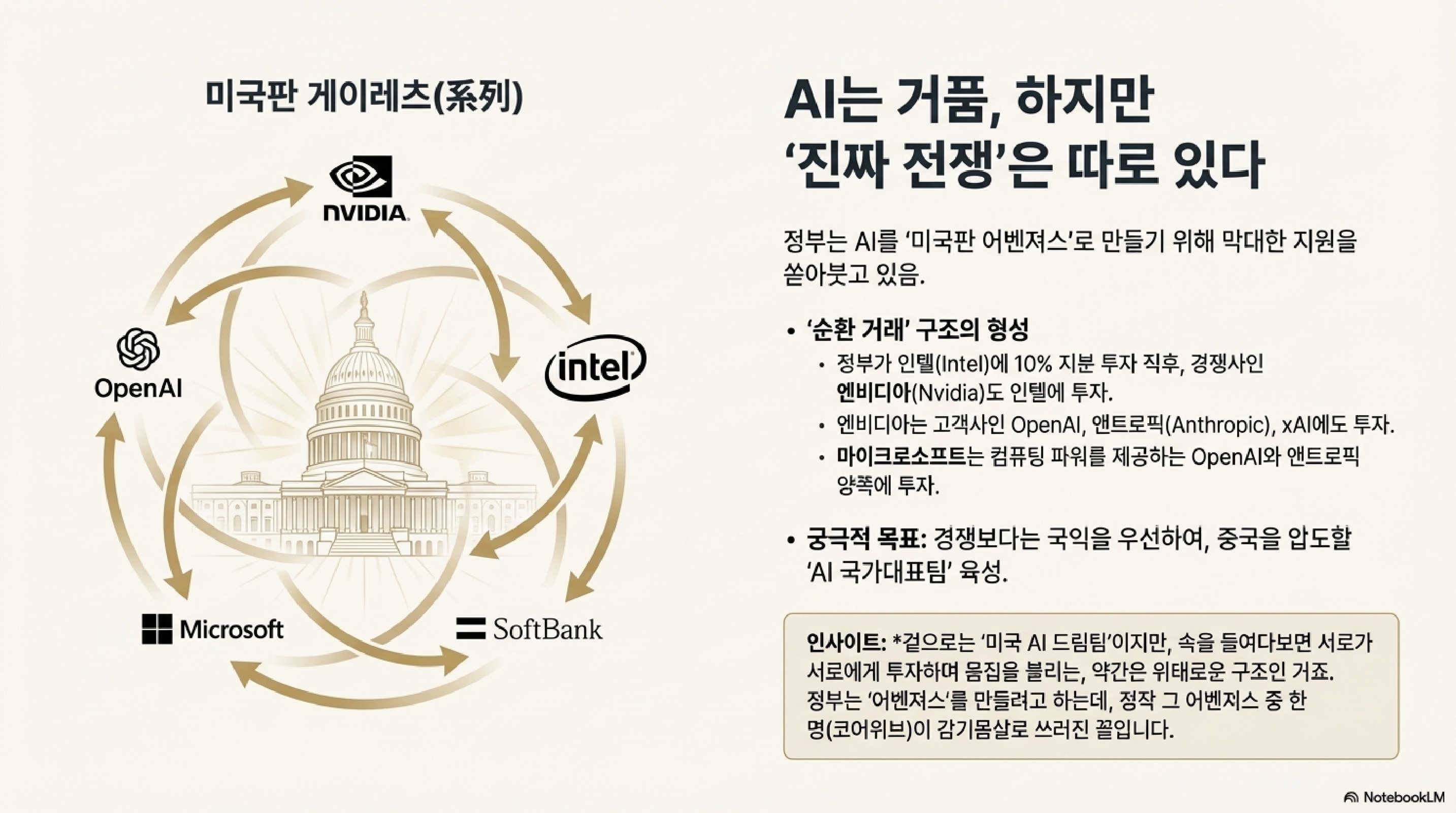 심지어 서로 물고 물리는 '순환 거래(circular deals)'도 나타납니다. 엔비디아는 경쟁사이자 협력사인 인텔과 고객사인 OpenAI에 투자하고, 마이크로소프트는 OpenAI에 투자하는 식입니다. 월스트리트저널은 이 구조가 과거 일본의 '케이레츠(系列)', 즉 대기업을 중심으로 하청업체들이 똘똘 뭉쳤던 그 시스템과 닮았다고 분석합니다. 국가와 특정 기업들이 한 몸처럼 움직이며 거대한 이익 집단을 형성하는 거죠.