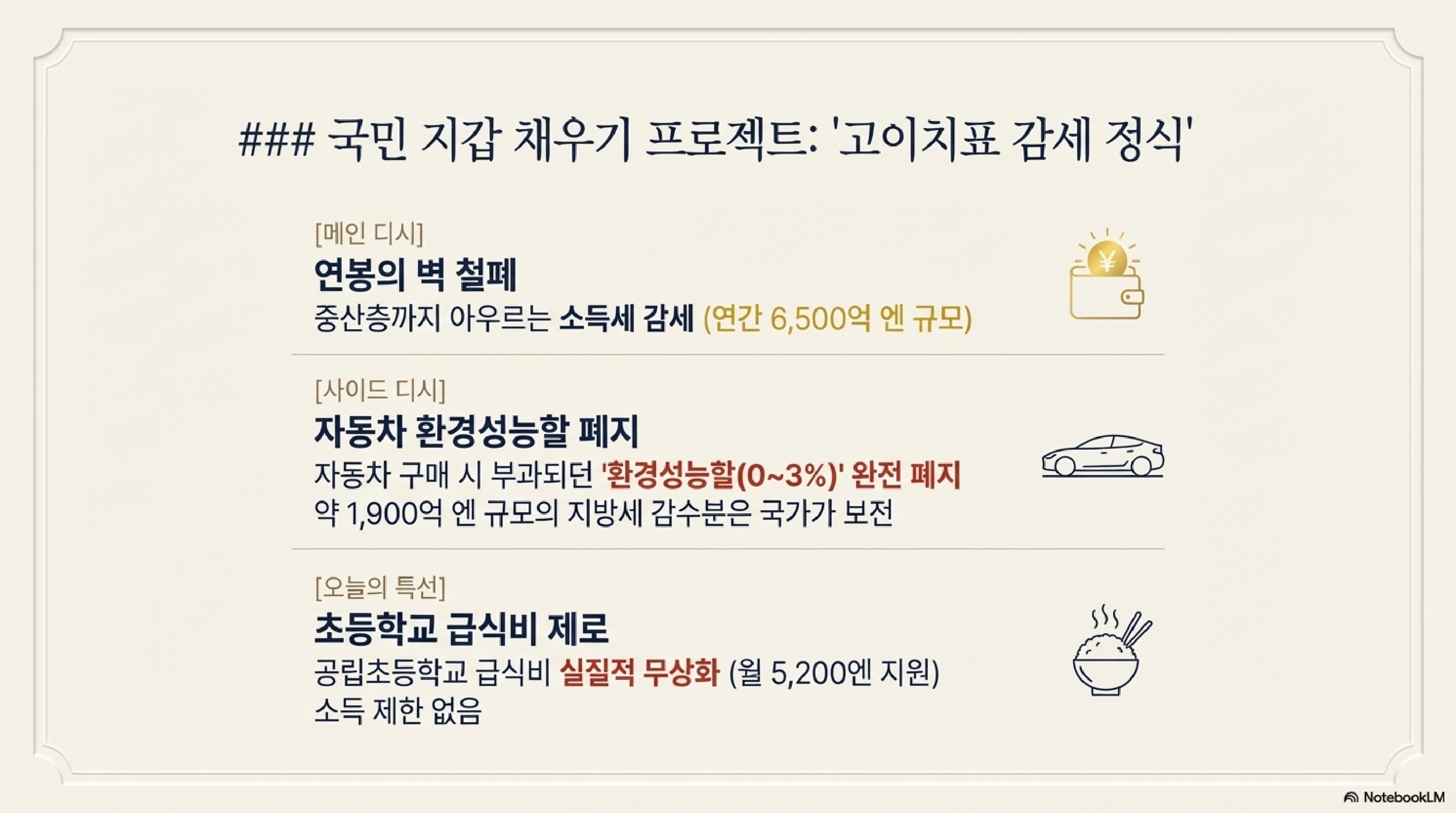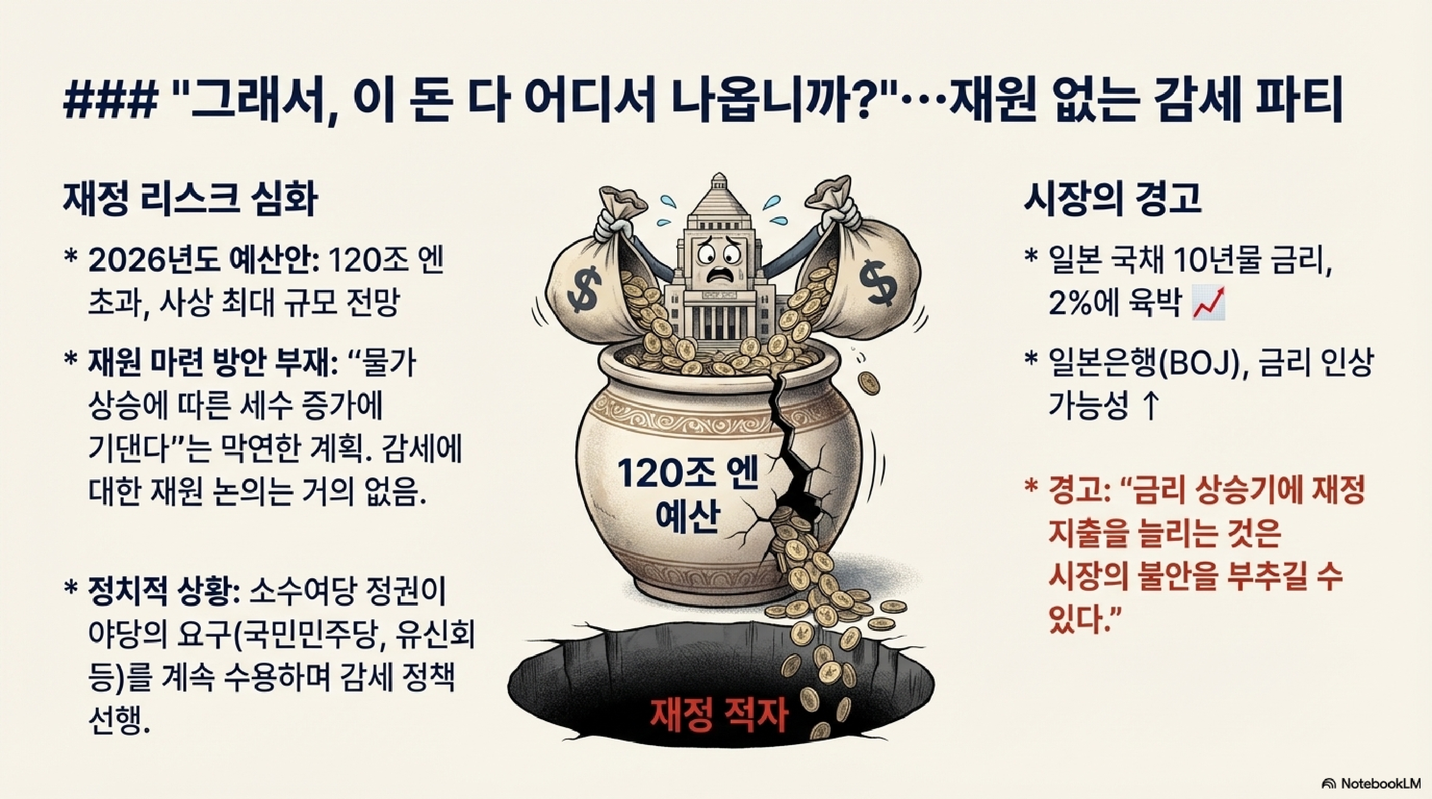 요즘 일본 정부의 재정 정책을 보면 마치 두 얼굴의 사나이를 보는 것 같습니다. 한쪽에서는 물가 상승으로 힘든 서민들에게 감세라는 달콤한 '당근'을 건네면서, 다른 한쪽에서는 막대한 방위비 증액이라는 무시무시한 '청구서'를 슬그머니 준비하고 있거든요. 이 이중적인 정책의 본질을 한번 들여다보겠습니다.