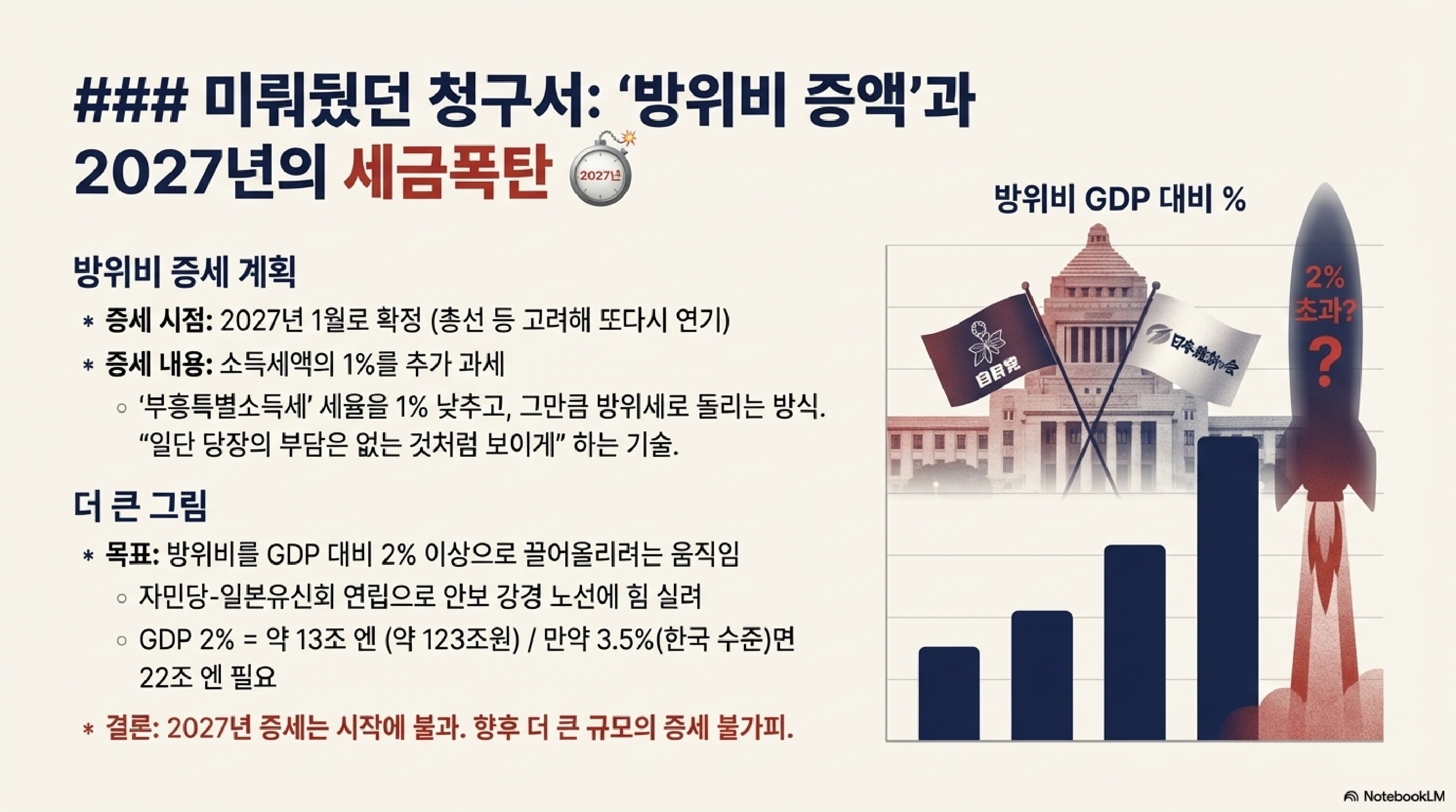 하지만 이 당근의 단맛이 채 가시기도 전에, 쓴맛 나는 청구서가 기다리고 있습니다. 바로 방위비 증세를 위한 소득세 인상 계획입니다. 일본 정부는 방위력을 강화하기 위해 GDP 대비 2%를 훌쩍 넘는 수준까지 국방 예산을 늘리려고 하는데요. 이를 위한 소득세 증세 계획이 사라진 게 아니라, 2027년 1월로 시기만 살짝 늦춰졌을 뿐입니다. 결국 지금 깎아주는 세금은 잠시 맛보는 '미끼'고, 몇 년 뒤에는 더 큰 세금으로 돌아올 수 있다는 이야기입니다.