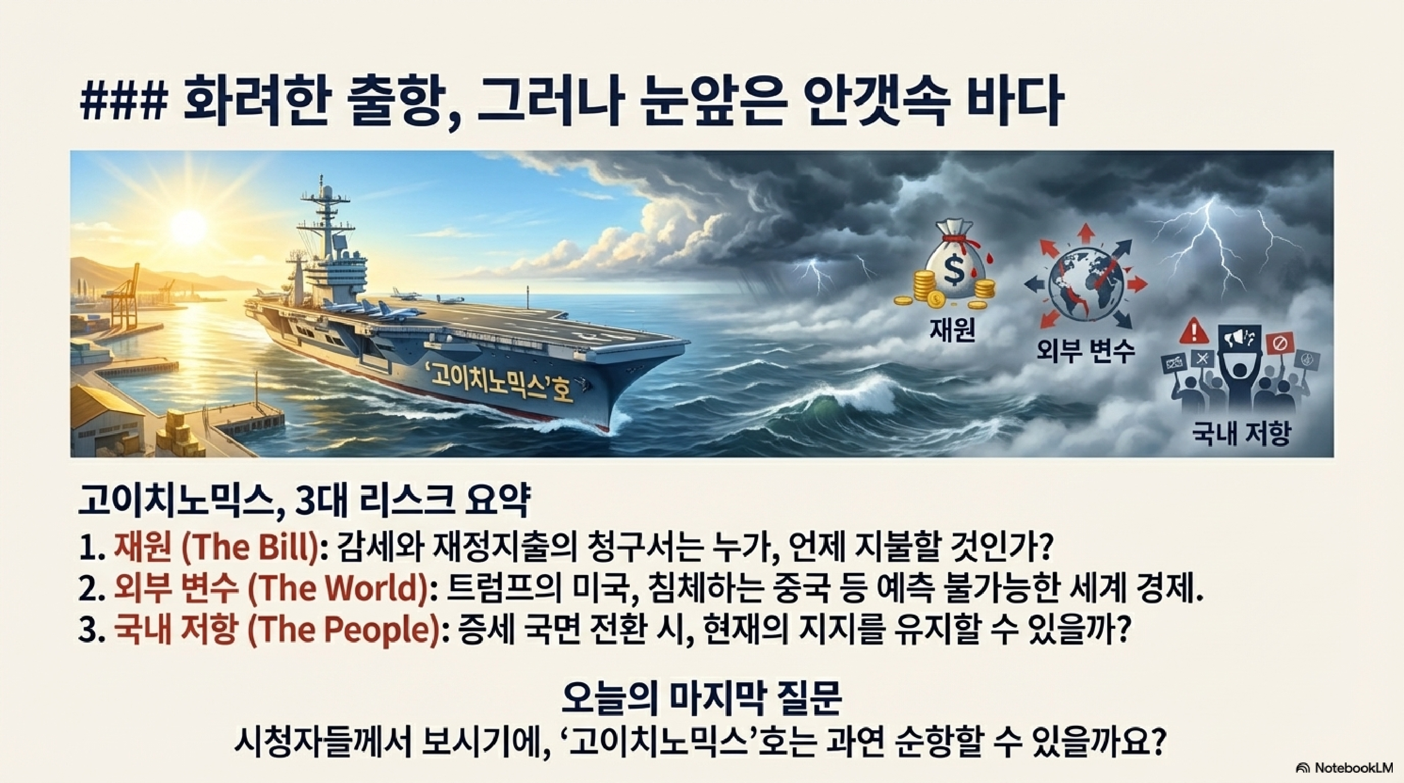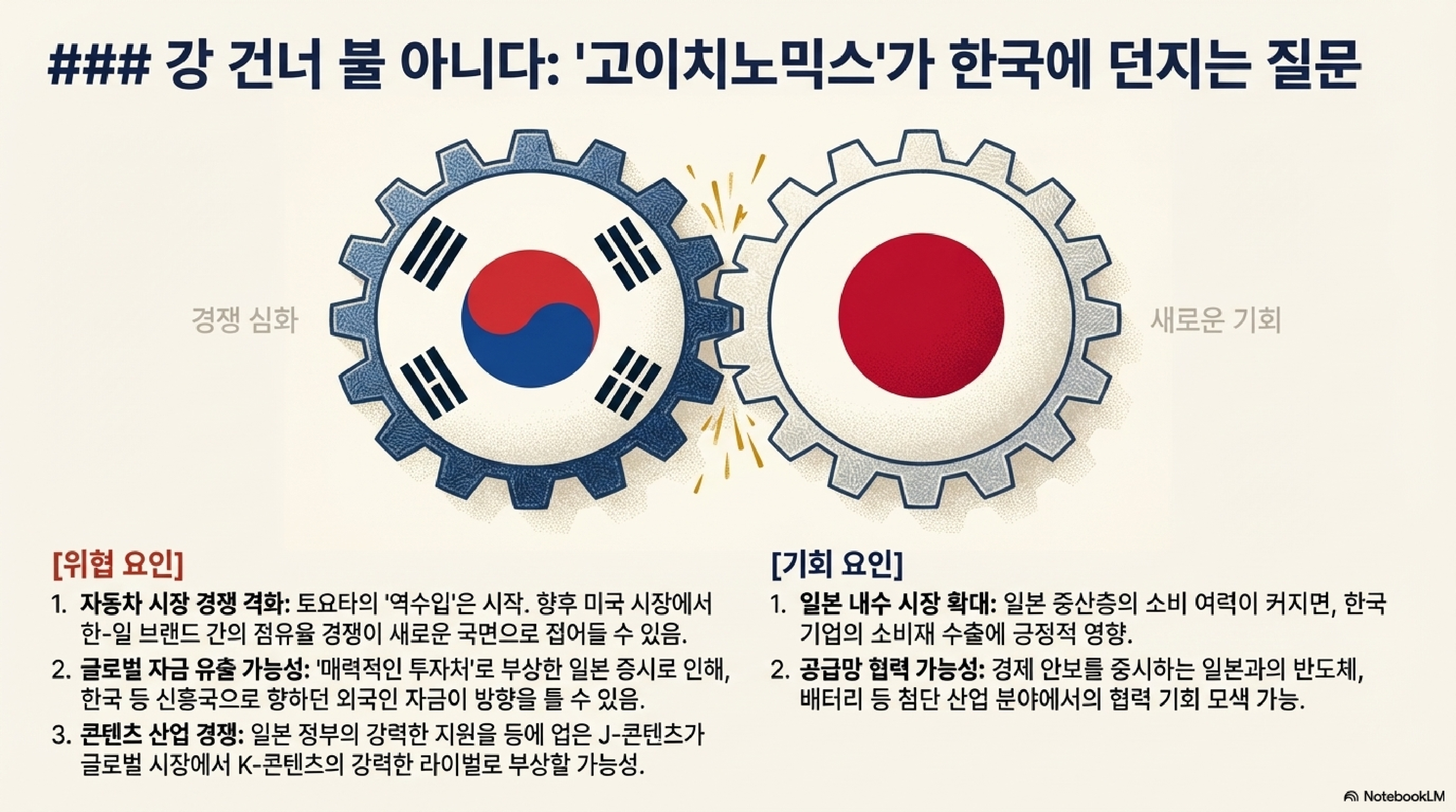 이 모든 현상은 결국 일본이 국내외의 거대한 변화라는 파도 속에서 어떻게 항해하고 있는지를 보여주는 단면들입니다. 기업은 정치의 파도를, 소비자는 기술의 파도를, 국가는 안보의 파도를 넘고 있습니다. 그리고 이 파도가 향하는 곳은 어쩌면 '경제 대국' 일본을 넘어, '안보 강국'으로서의 정체성을 재정립하려는 새로운 항구일지도 모릅니다. 오늘 살펴본 일본 경제의 모습이었습니다. 저는 다음 시간에 더 날카롭고 재밌는 인사이트로 돌아오겠습니다.