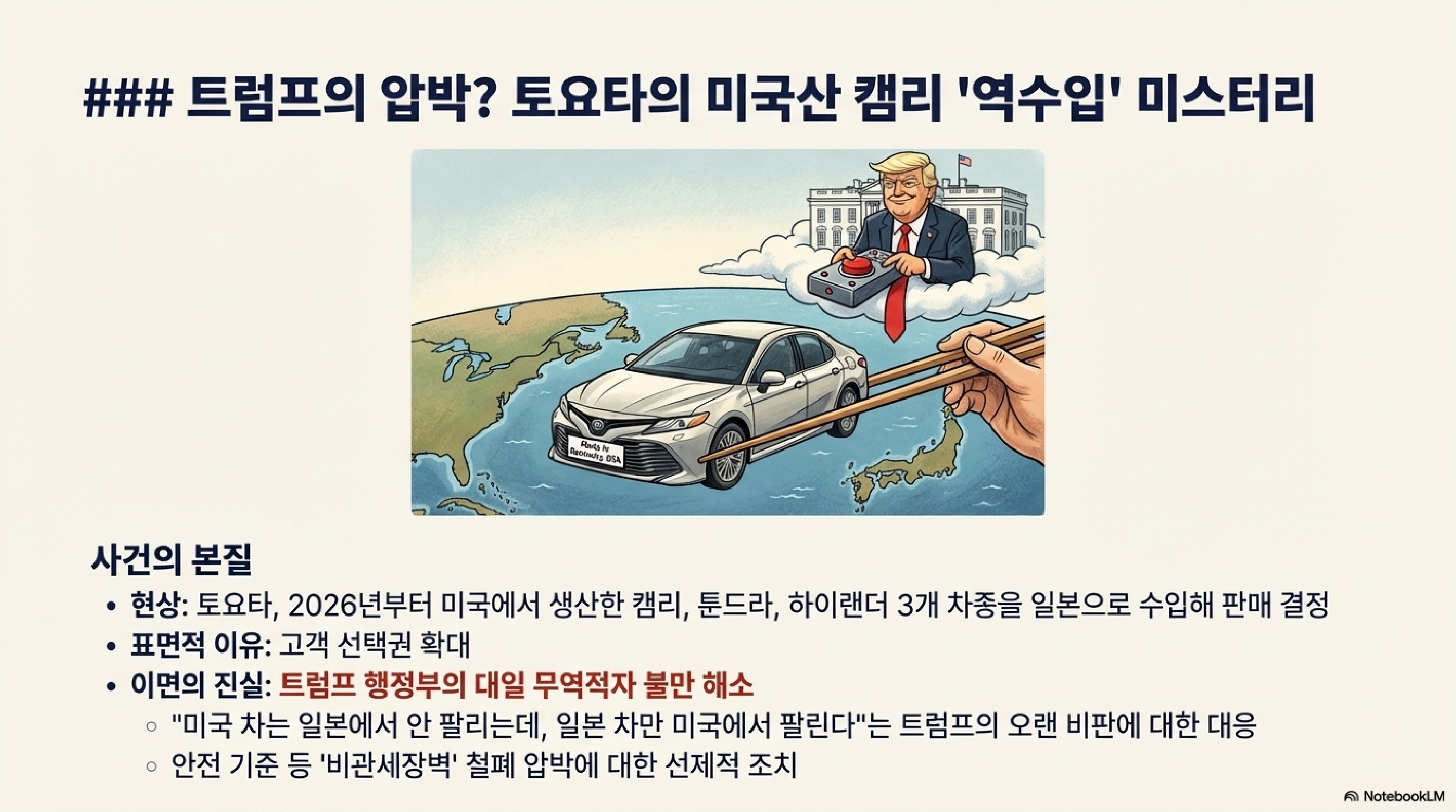 시청자들께서도 '기러기', '토마토', '스위스'처럼 거꾸로 해도 똑같은 단어들 아시죠? 그런데 요즘 일본 경제 뉴스를 보면 이런 '회문' 저리 가라 할 정도로 이상하고 뒤집힌 일들이 벌어지고 있습니다. 세계적인 자동차 회사 도요타가 미국에서 만든 자기네 차를 다시 일본으로 수입하겠다고 하고, 정부는 우리 주머니를 지켜주겠다며 스마트폰 앱 수수료를 내리라고 칼을 빼 들었는데 정작 요금은 그대로일 것 같다는 소식도 들려옵니다. 심지어 한 손으로는 세금을 깎아주겠다며 생색을 내면서, 다른 한 손으로는 국방비를 올려야 하니 세금을 더 내라고 청구서를 내밀고 있습니다. 언뜻 보면 "대체 이게 무슨 소리야?" 싶은 황당한 뉴스들이지만, 그 속을 한 꺼풀 벗겨보면 아주 치열한 정치적, 경제적 계산이 깔려있습니다. 기러기, 토마토, 스위스도 아니고... 일본 차를 일본으로 다시 수입한다고? 대체 이게 무슨 황당한 소리인지 오늘 제대로 파헤쳐 보겠습니다.