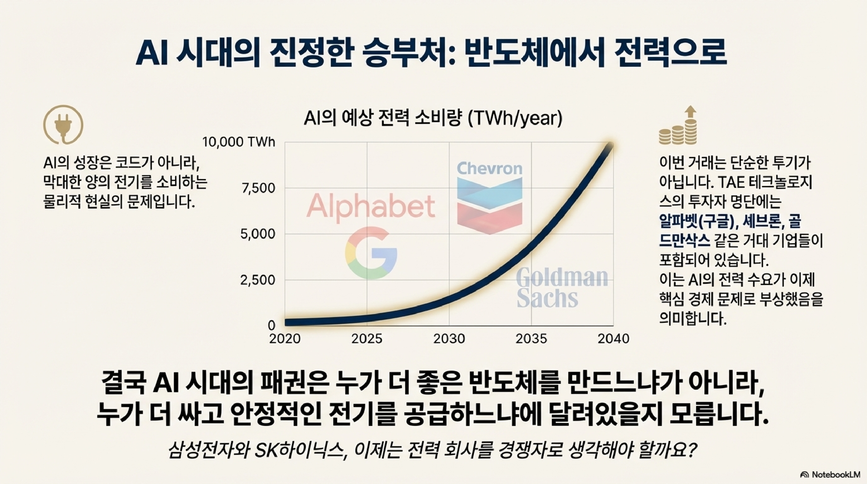 시청자들께서 주목해야 할 점은 이겁니다. 이 AI 경쟁의 본질은 단순히 더 똑똑한 챗봇을 만드는 싸움이 아닙니다. 이건 바로 '전력' 확보 전쟁입니다.