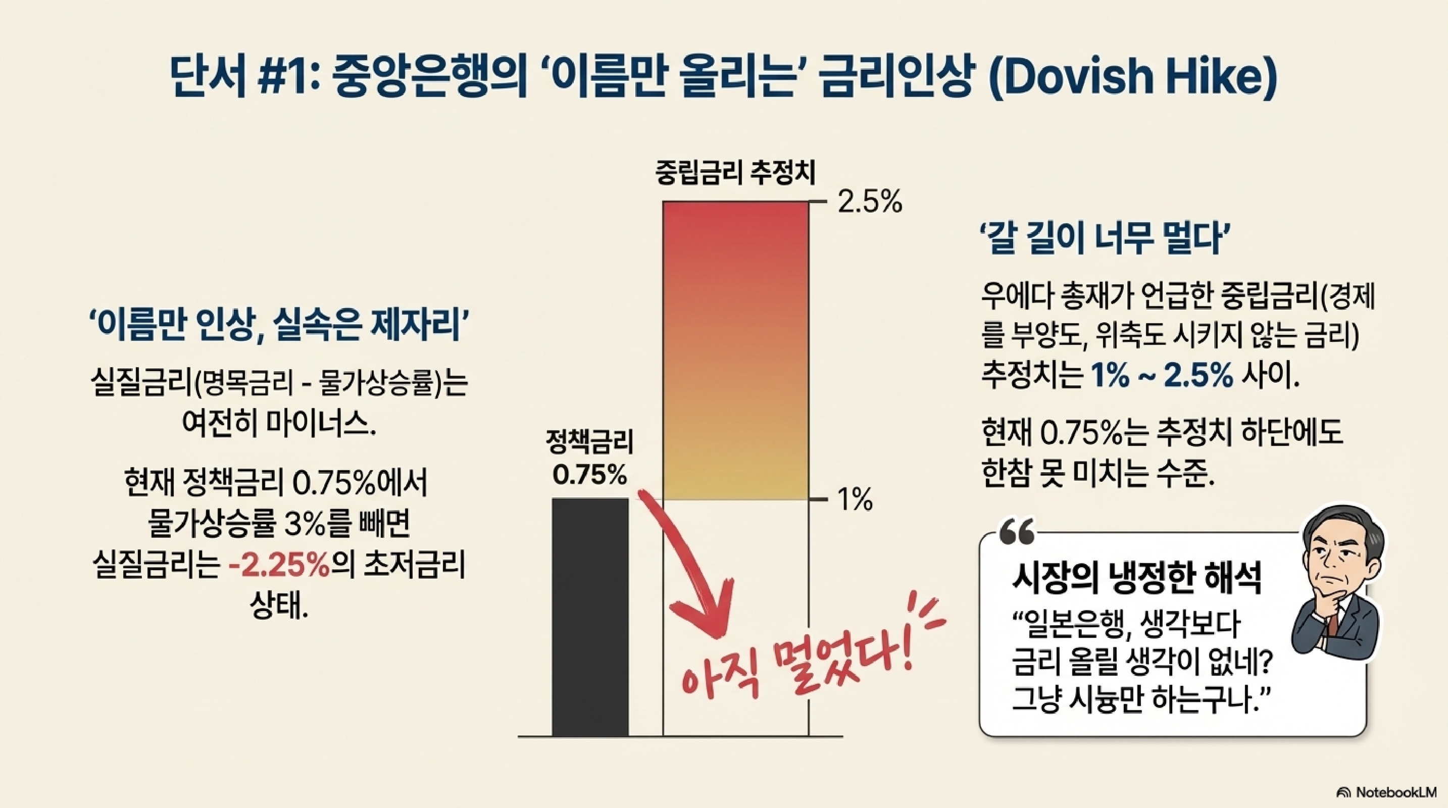 - 중립금리: 쉽게 말해 경제에 열을 가하지도, 식히지도 않는 '정상 체온' 같은 금리입니다. 자동차로 치면 과속도 아니고 서행도 아닌 딱 적정 속도죠. 일본은행은 이 중립금리의 하한선을 대략 1% 정도로 보고 있습니다. 현재 정책금리가 0.75%니까, 아직 '정상 체온'에는 못 미치는 미지근한 상태라는 겁니다. 그래서 "아직은 괜찮다, 완화적이다"라고 말할 수 있는 거죠.