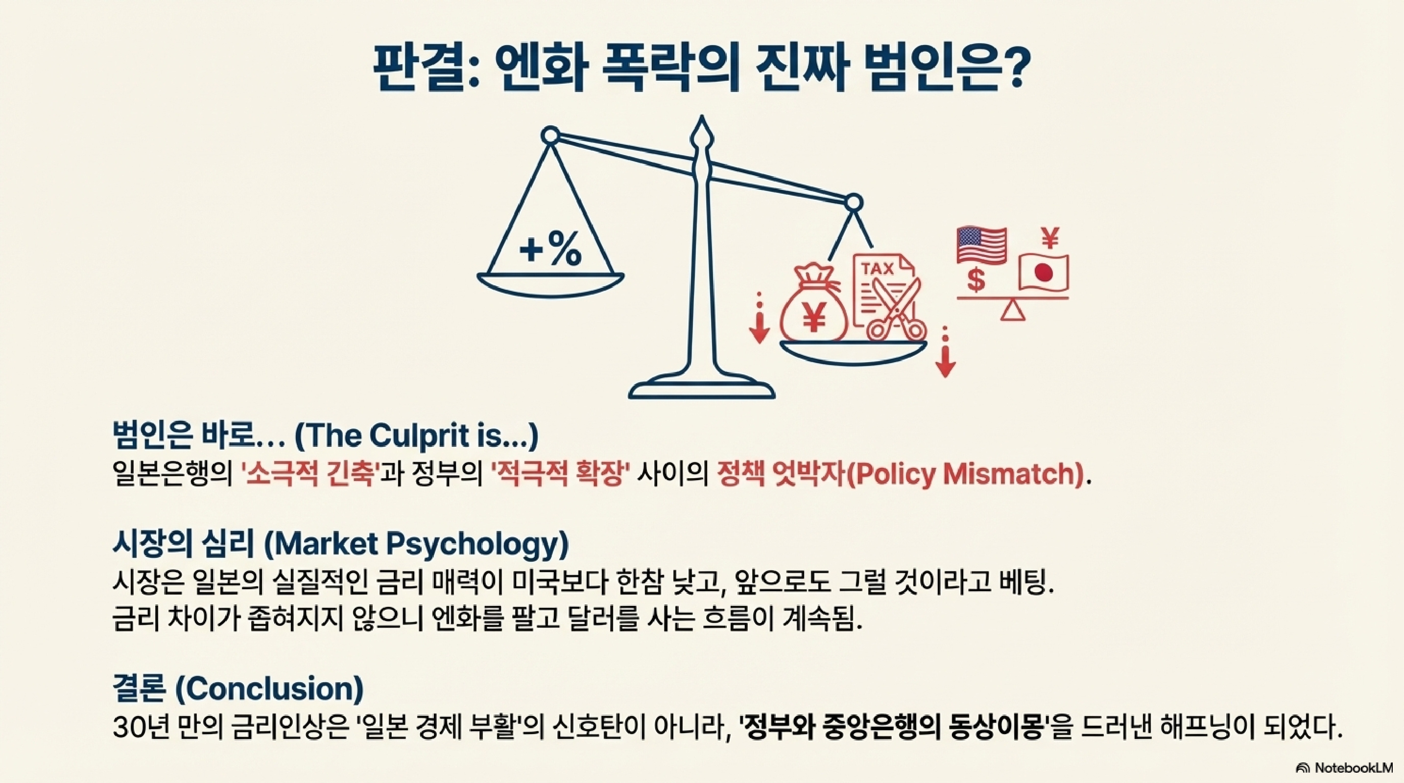 이 현상의 원인은 한마디로 "시장의 기대에 못 미쳤기 때문"입니다. 시장은 더 공격적이고 화끈한 금리 인상 신호, 즉 "앞으로도 팍팍 올릴 거야!"라는 우에다 총재의 매파적인 발언을 기대했습니다. 하지만 정작 나온 건 "아직 완화적이야"라는 신중한 태도였죠. 여기에 실망한 투자자들이 "에이, 일본은행 아직 멀었네" 하면서 엔화를 팔아치운 겁니다.