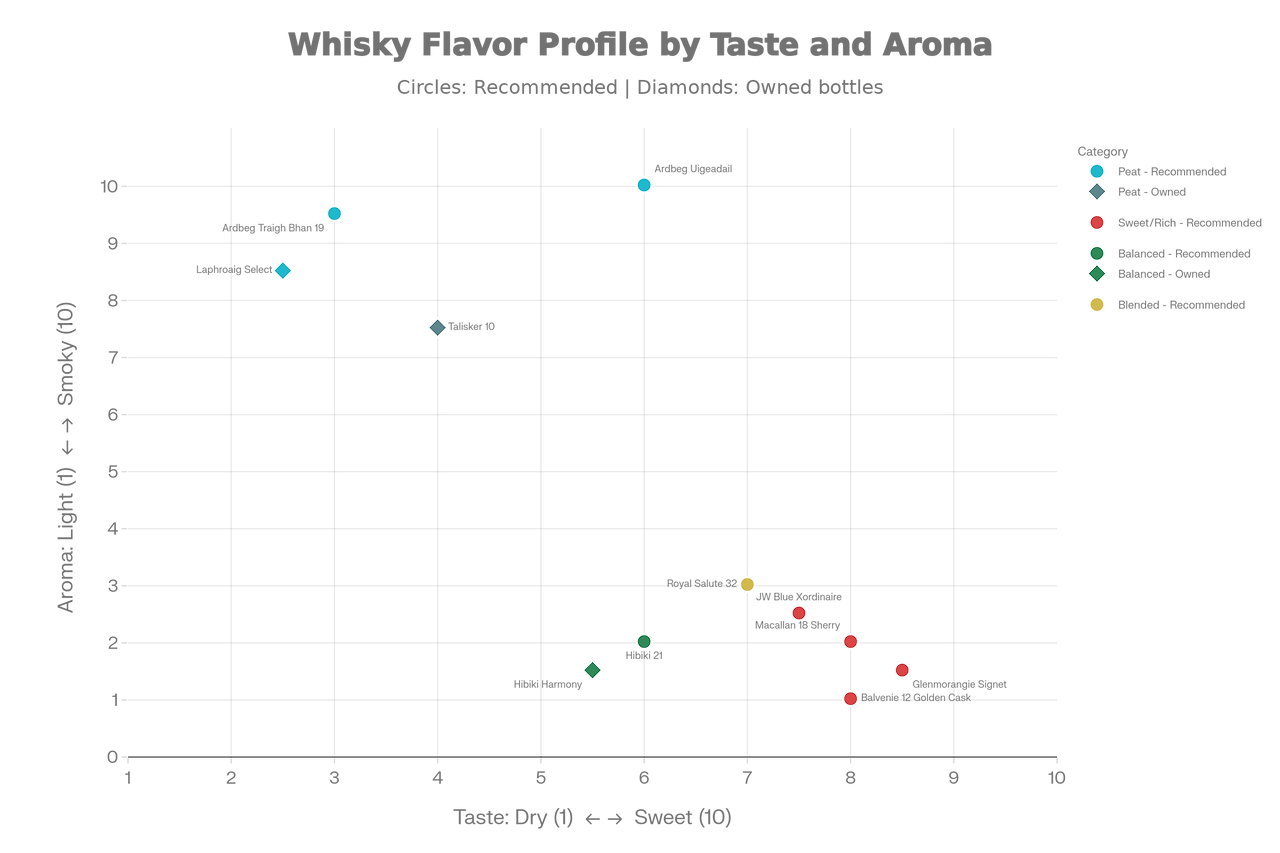 "히비키 21년은 보이면 무조건 집어야 할 '유니콘'이며, 맛으로는 글렌모렌지 시그넷이 최고의 가성비를 보여줍니다. 피트 러버라면 아드벡 19년은 필수 코스입니다."