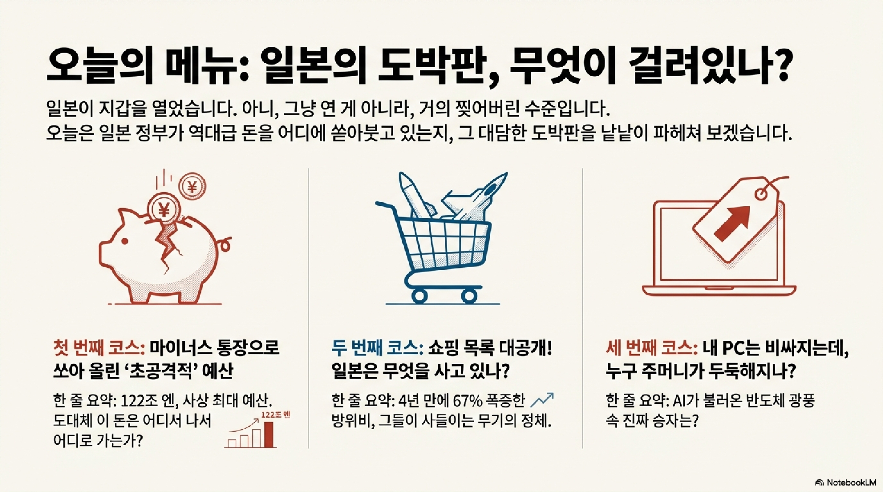 일본 다카이치 내각이 '강한 경제'를 실현하겠다며 내놓은 2026년도 예산안, 그 규모가 무려 122조 3,092억 엔(약 1,100조 원)에 달합니다. 사상 최대 규모죠. 내용을 뜯어보면 이게 '강한 경제'를 위한 투자일지, 아니면 '위험한 도박'일지 아슬아슬한데요. 가장 돈이 많이 들어가는 세 군데만 살펴보겠습니다.