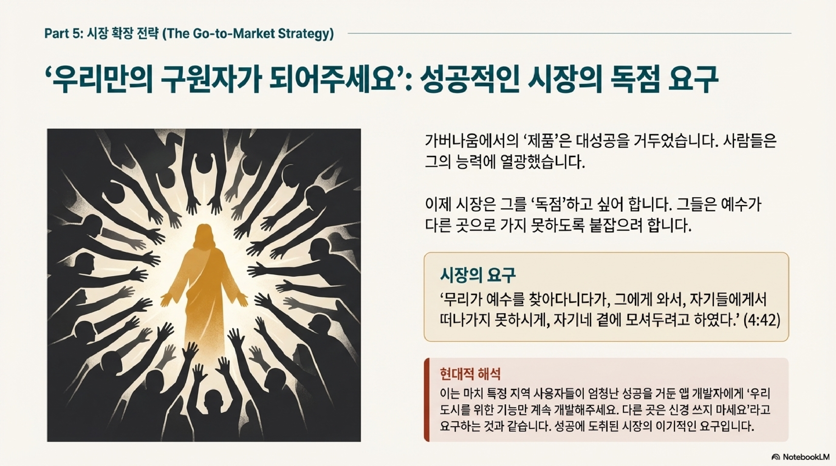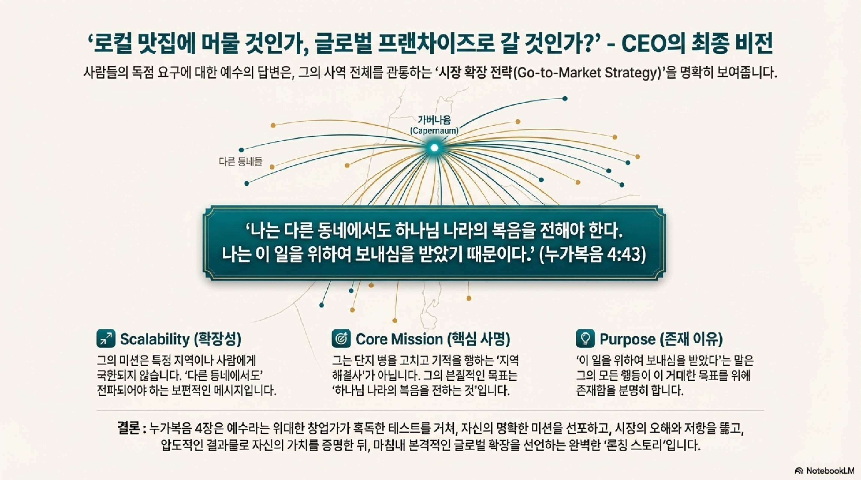 예수님의 목표는 한 지역의 유명한 '치료사'나 인기 있는 '슈퍼스타'가 되는 것이 아니었습니다. 그의 핵심 사명은 바로 '하나님 나라의 복음 전파'였습니다. 가버나움에서의 기적과 치유는 그 자체가 목적이 아니라, 하나님 나라가 이미 임했다는 것을 보여주는 '증거'이자 복음을 위한 '수단'이었던 것입니다. 인기에 취해 본질적인 사명을 잊지 않겠다는 단호한 선언입니다.