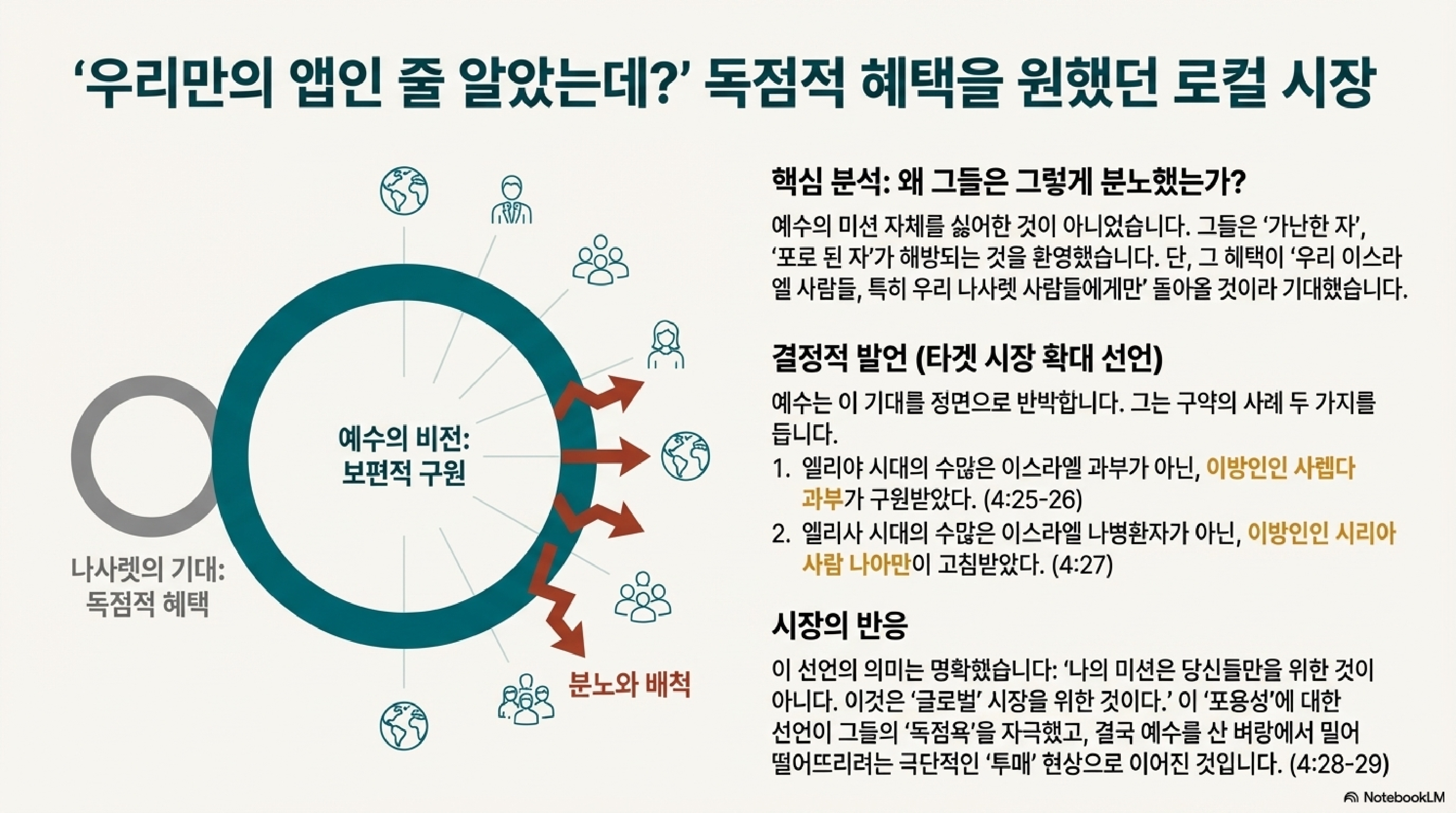 자, 여기서부터 진짜 드라마가 시작됩니다. 광야 시험을 통과하고 성령의 능력을 입은 예수님은 자신의 고향 나사렛으로 돌아오십니다(4:14). 모든 영웅담의 공식대로라면 금의환향한 주인공은 뜨거운 박수를 받아야 하잖아요? 그런데 예수님의 데뷔전은... 뭐랄까, K-POP 아이돌이 야심차게 솔로 앨범을 냈는데 팬카페가 통째로 안티로 돌아선 격이랄까요? 대체 나사렛에서 무슨 일이 있었던 걸까요?