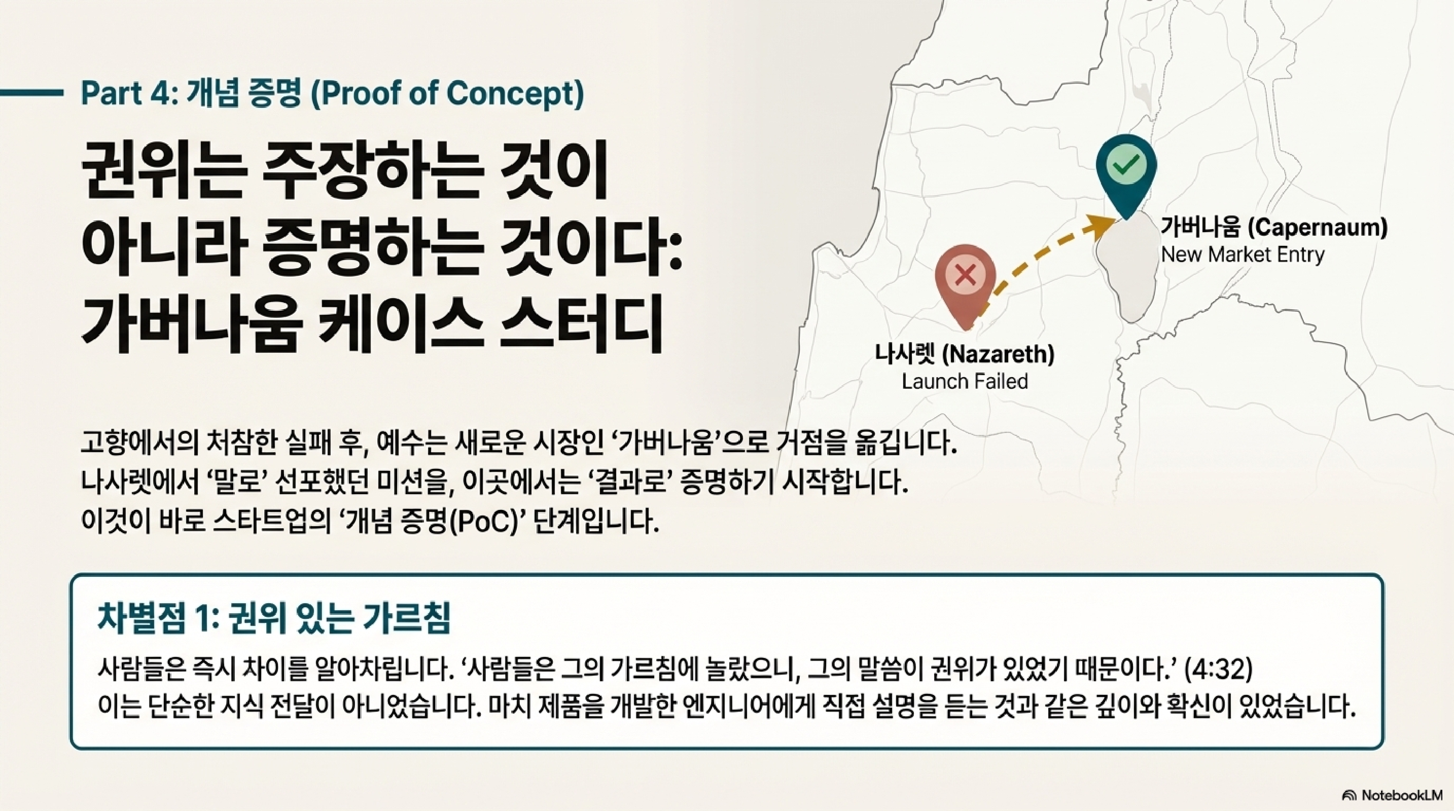 나사렛에서의 배척과 극명하게 대비되는 곳이 바로 옆 동네 가버나움입니다. 나사렛이 '우리가 아는 사람'이라는 선입견의 감옥에 갇혀 있었다면, 가버나움은 그 선입견이 없었기에 예수님의 권위 그 자체를 있는 그대로 받아들일 수 있었습니다. 진리는 종종 우리의 편견이 없는 곳에서 가장 선명하게 드러나는 법입니다. 이번 세션에서는 '권위'라는 키워드를 중심으로, 나사렛 사람들이 알아보지 못했던 예수님의 영향력이 어떻게 실제로 나타나고 확산되었는지 살펴보겠습니다.