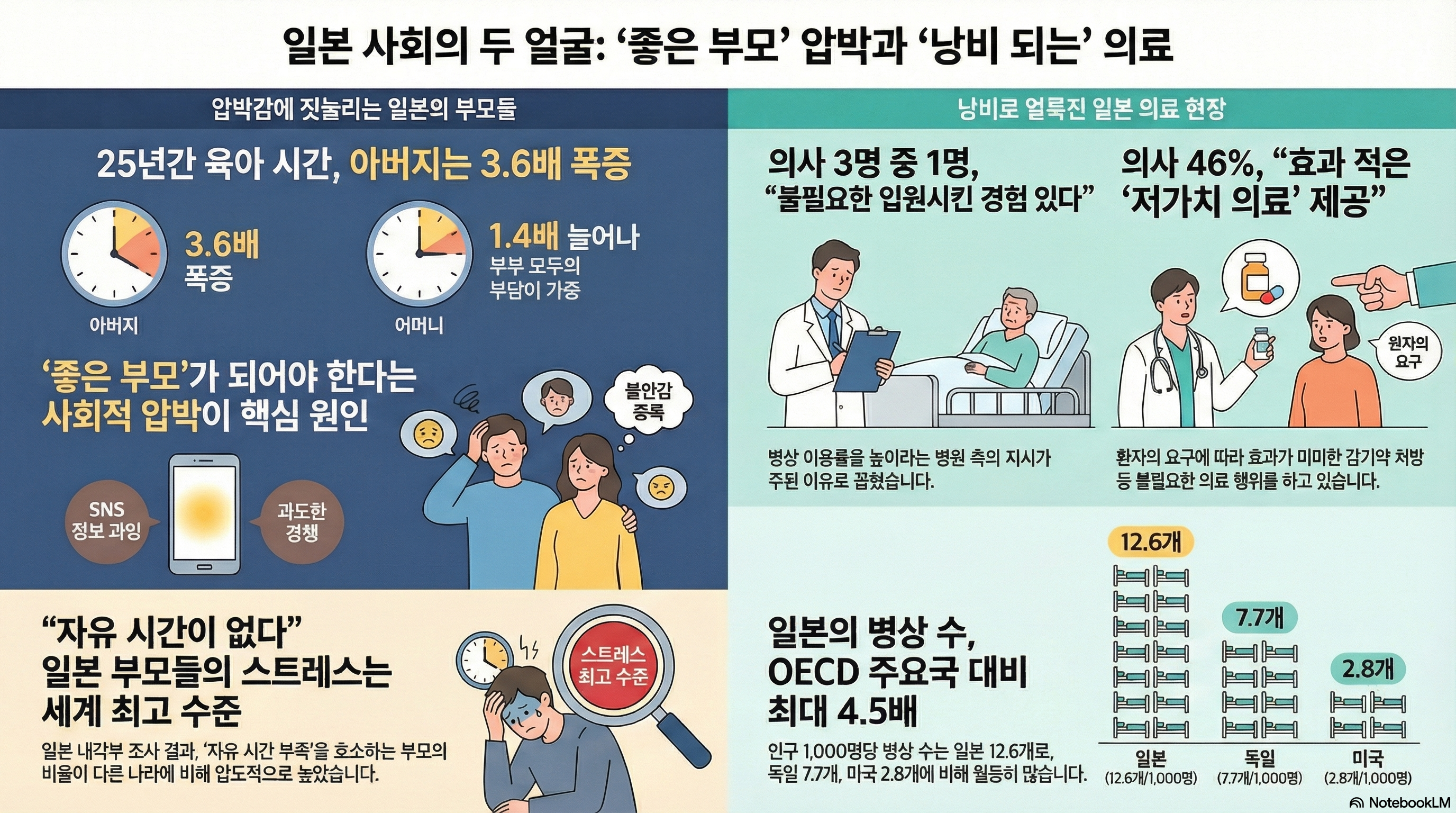 언뜻 보면 아무 상관없어 보이는 이 이야기들이 사실은 하나의 거대한 흐름을 가리키고 있습니다. 육아의 압박, 가족 관계의 변화, 한때 시장을 호령했던 기업의 몰락, 그리고 우리가 모르는 사이 새어 나가고 있는 의료비까지. 오늘 일본 사회의 흥미로운 단면들을 통해, 어쩌면 바로 우리 곁에 다가온 미래의 모습을 함께 들여다보시겠습니다.