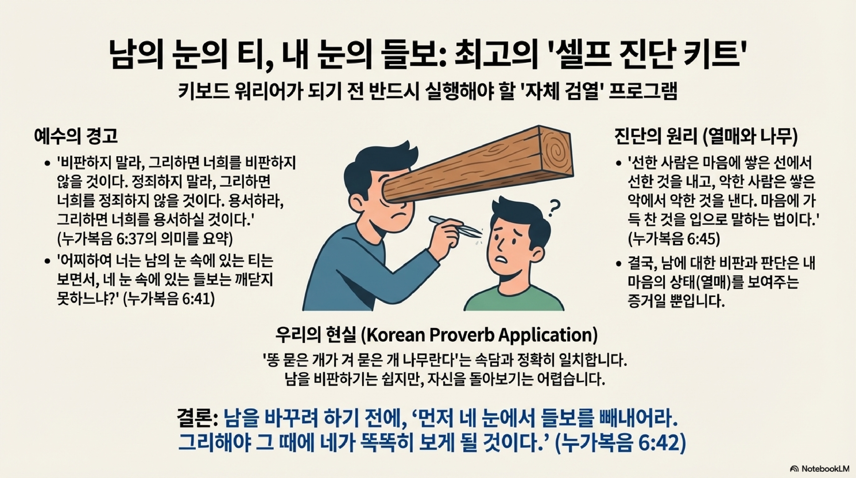 다른 사람의 단점을 지적하고 비판하는 것은 참 쉽습니다. 하지만 그 비판의 칼날을 스스로에게 돌리는 것은 지독히도 어렵죠. 예수님은 이런 인간의 위선을 날카롭게 꼬집으십니다. "어찌하여 너는 남의 눈 속에 있는 티는 보면서, 네 눈 속에 있는 들보는 깨닫지 못하느냐?" 잠깐 멈춰서 이 이미지의 슬랩스틱 코미디를 감상해 보시죠. 자기 눈에 거대한 대들보가 박혀 있는 사람이 다른 사람의 눈에 들어간 먼지를 빼주겠다며 섬세한 수술을 시도하는 모습입니다. 이건 위선을 넘어 거의 부조리극에 가깝습니다. 우리 속담으로 치면 '똥 묻은 개가 겨 묻은 개 나무란다'는 격이죠.