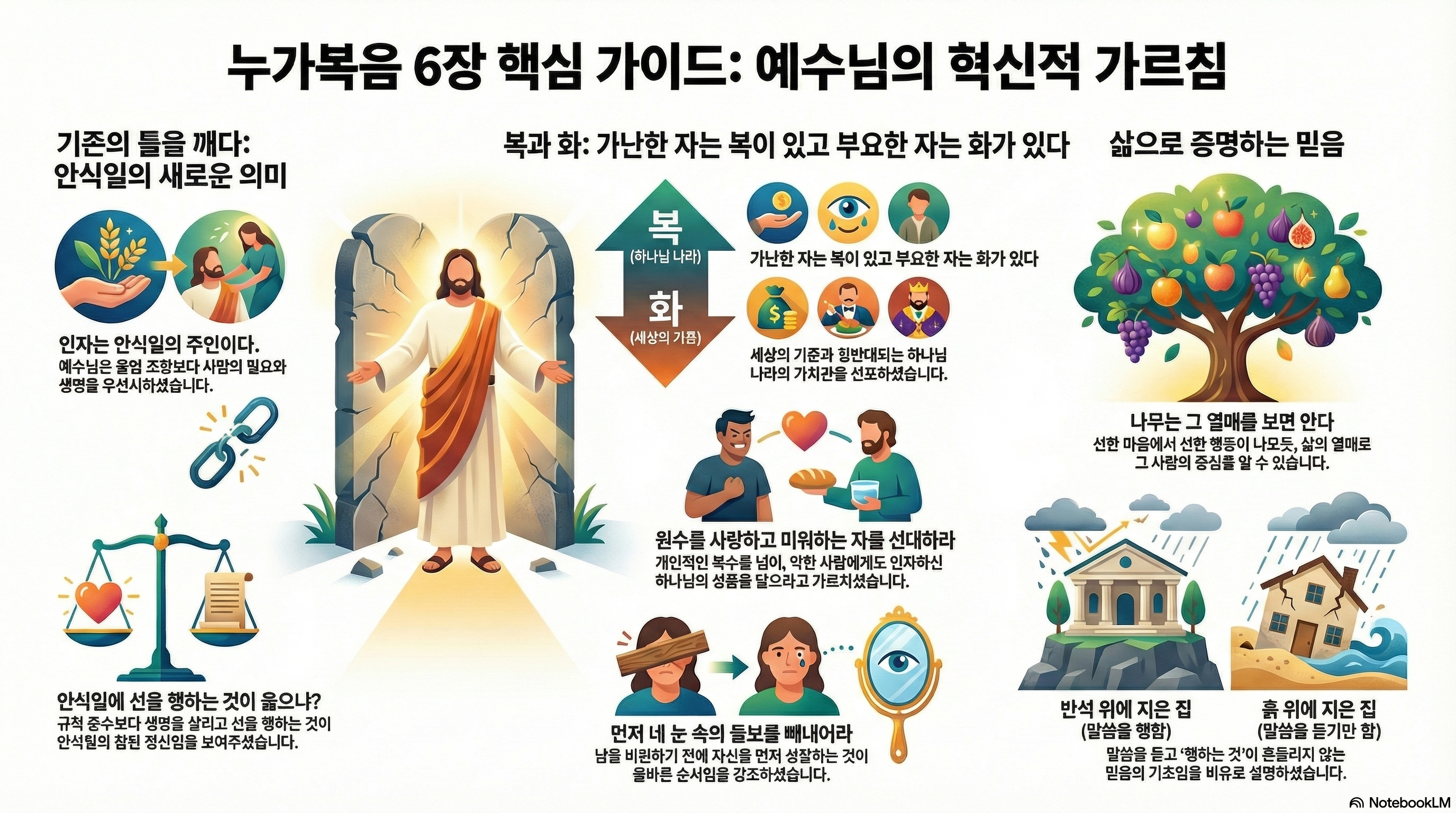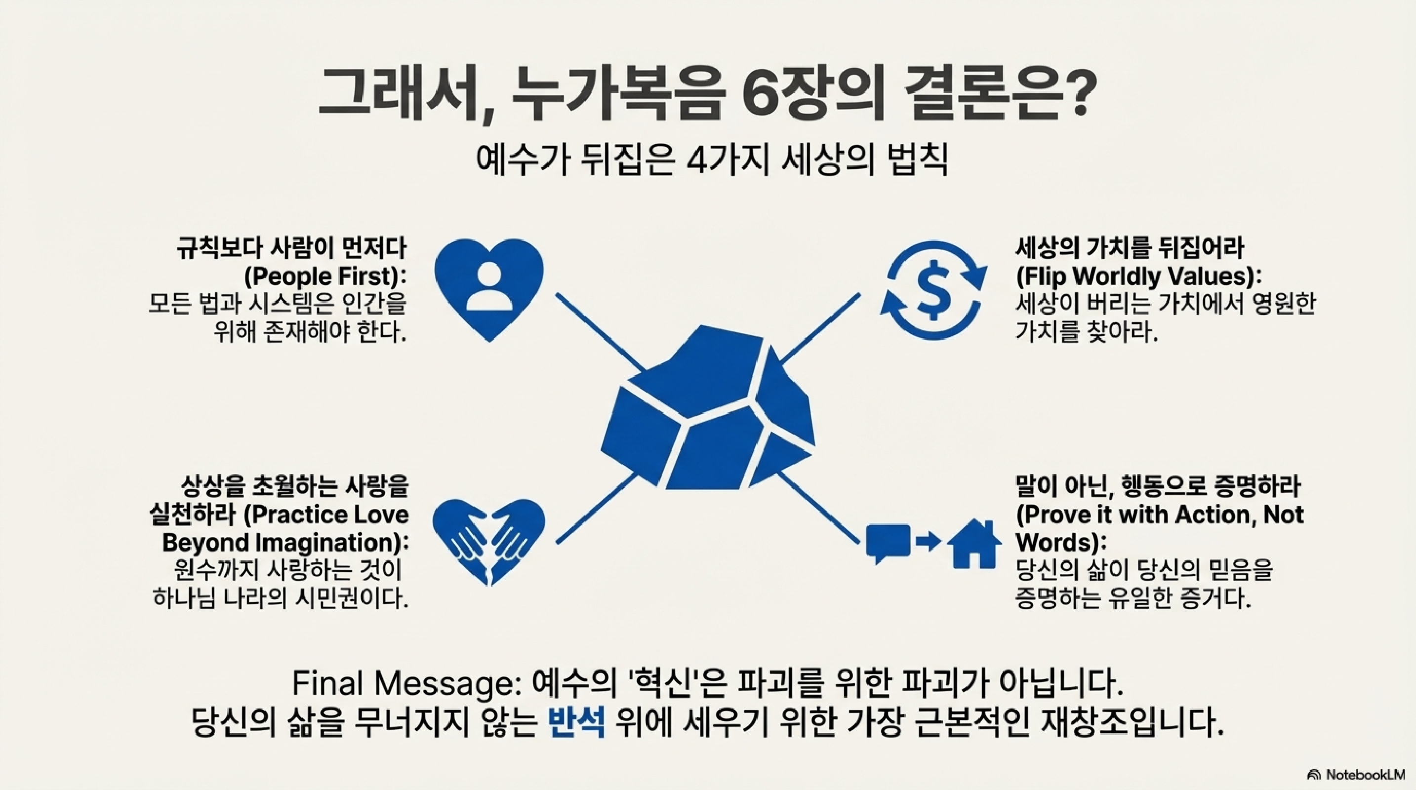 누가복음 6장을 관통하는 예수님의 메시지는 명확합니다. 그분은 낡고 생명력 없는 규칙의 노예가 되기를 거부하고, 고통받는 '사람'을 그 중심에 두셨습니다. 그리고 그분이 세우고자 하는 하나님의 나라는, 세상의 성공 논리와 가치관을 완전히 뒤집는 역설적인 사랑과 구체적인 실천의 공동체입니다.
