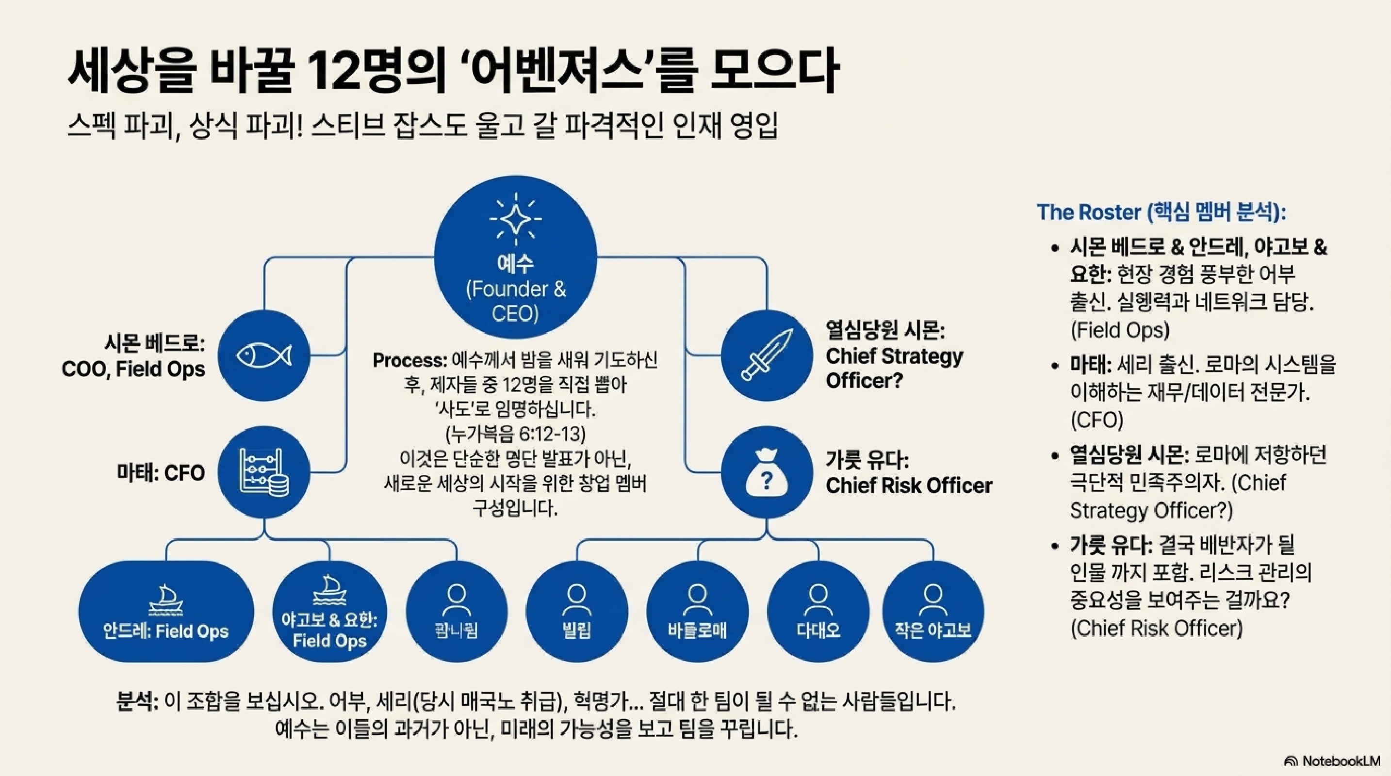 모든 위대한 시작에는 위대한 팀이 있었습니다. 스티브 잡스에게 스티브 워즈니악이 있었던 것처럼 말이죠. 예수님의 공생애 사역 역시 마찬가지입니다. 이제 막 기득권과 정면으로 충돌하기 시작한 이 시점에서, 예수님은 마치 위대한 스타트업의 창업자처럼 자신의 비전을 실현할 핵심 멤버들을 모으십니다. 세상을 바꿀 '어벤져스'의 탄생이라고나 할까요?