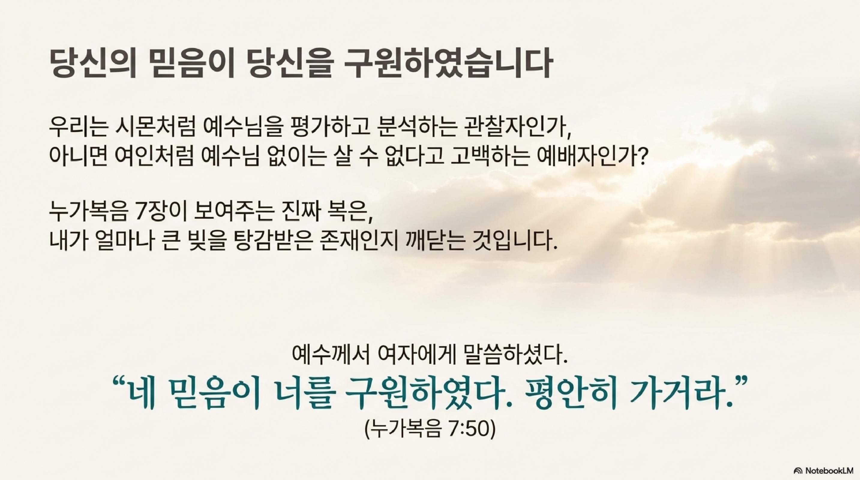 이것이 최종 결론입니다. 여자를 구원한 것은 그녀의 눈물도, 비싼 향유도 아니었습니다. 그 모든 행위를 가능하게 했던 근원, 즉 예수님만이 자신의 죄를 용서하고 구원하실 수 있다는 절대적인 '믿음'이 그녀를 구원한 것입니다.