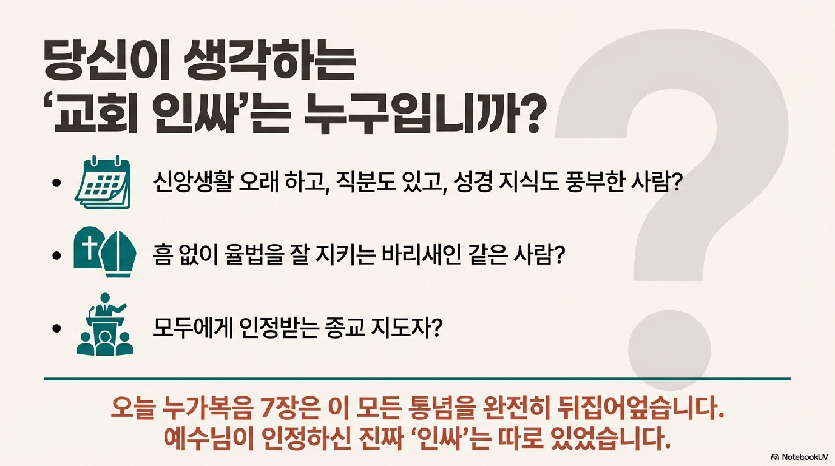 - 진짜 믿음은 나의 자격이 아닌, 주님의 권능을 신뢰하는 것입니다 (백부장).