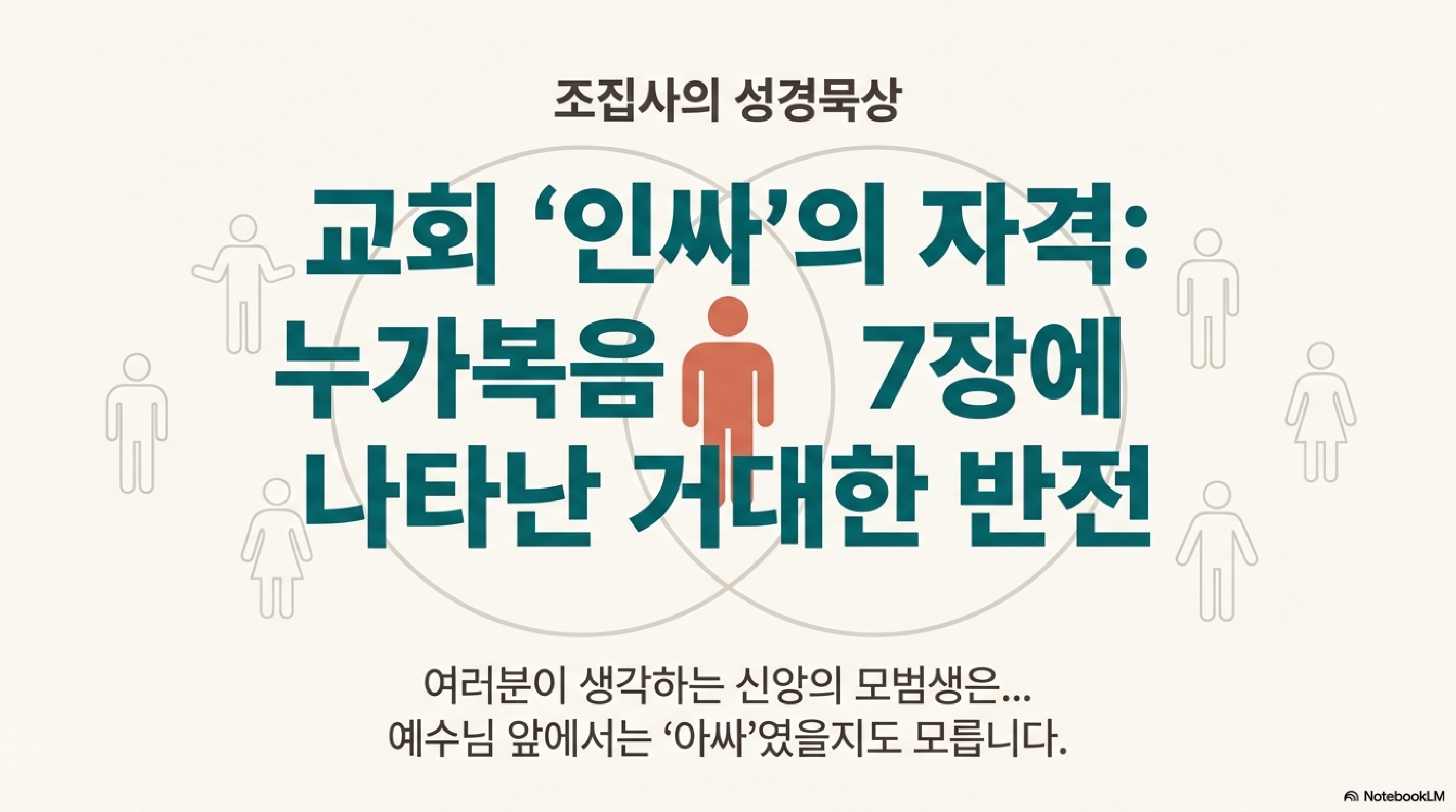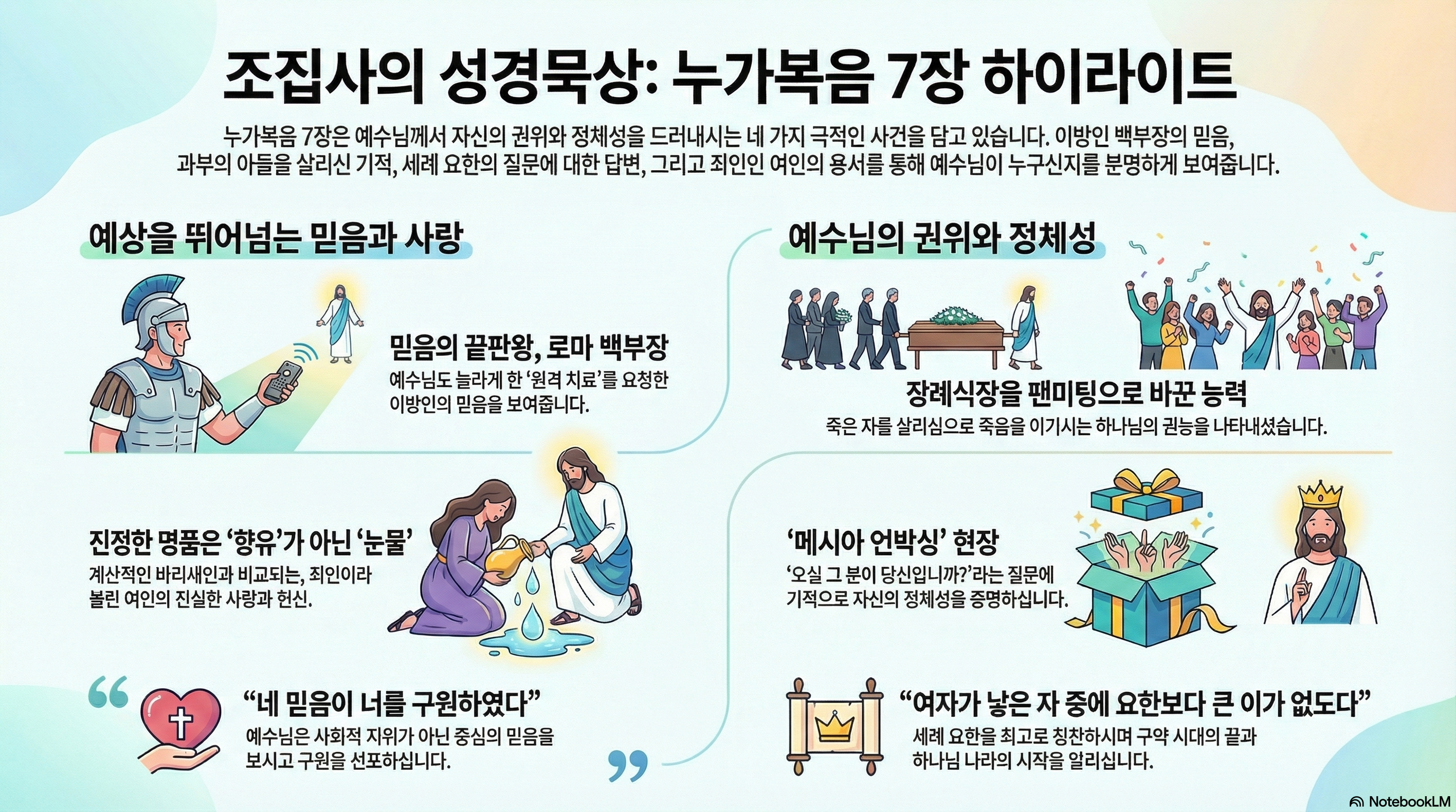 오늘 우리가 함께 살펴볼 누가복음 7장은 마치 한 편의 잘 짜인 옴니버스 드라마 시리즈 같습니다. 에피소드마다 각기 다른 주인공들이 등장하는데요, 라인업이 정말 화려합니다. 로마 군대의 최고 엘리트인 백부장, 모든 희망을 잃고 비통에 빠진 과부, 심지어 예수님의 길을 예비했던 위대한 선지자 세례 요한, 그리고 사회적으로 손가락질받던 한 죄인인 여자까지. 이 다양한 인물들이 각자의 삶의 자리에서 예수님을 만나며 벌어지는 극적인 사건들이 쉴 틈 없이 펼쳐집니다.