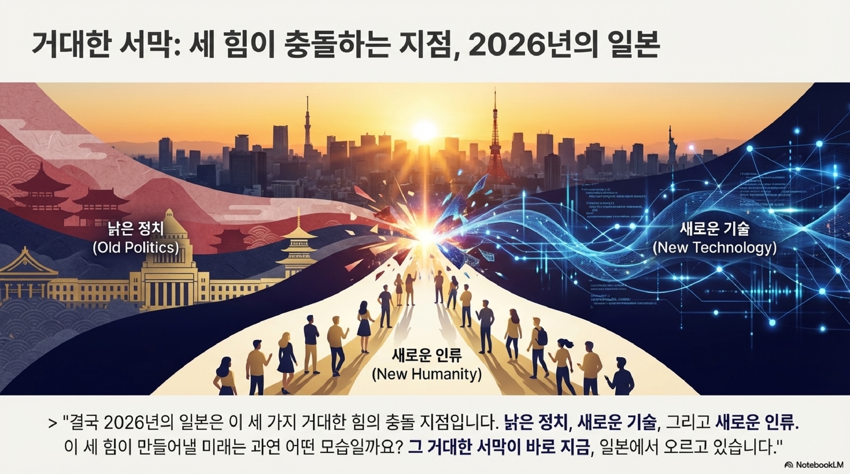 오늘 우리는 2026년 일본을 움직이는 세 가지 거대한 축을 살펴봤습니다. AI와 함께 미래를 설계하는 새로운 세대의 부상, 불확실성 속에서 리더십을 시험받는 정치, 그리고 기후와 기술에 의해 완전히 재편되는 우리의 평범한 일상.