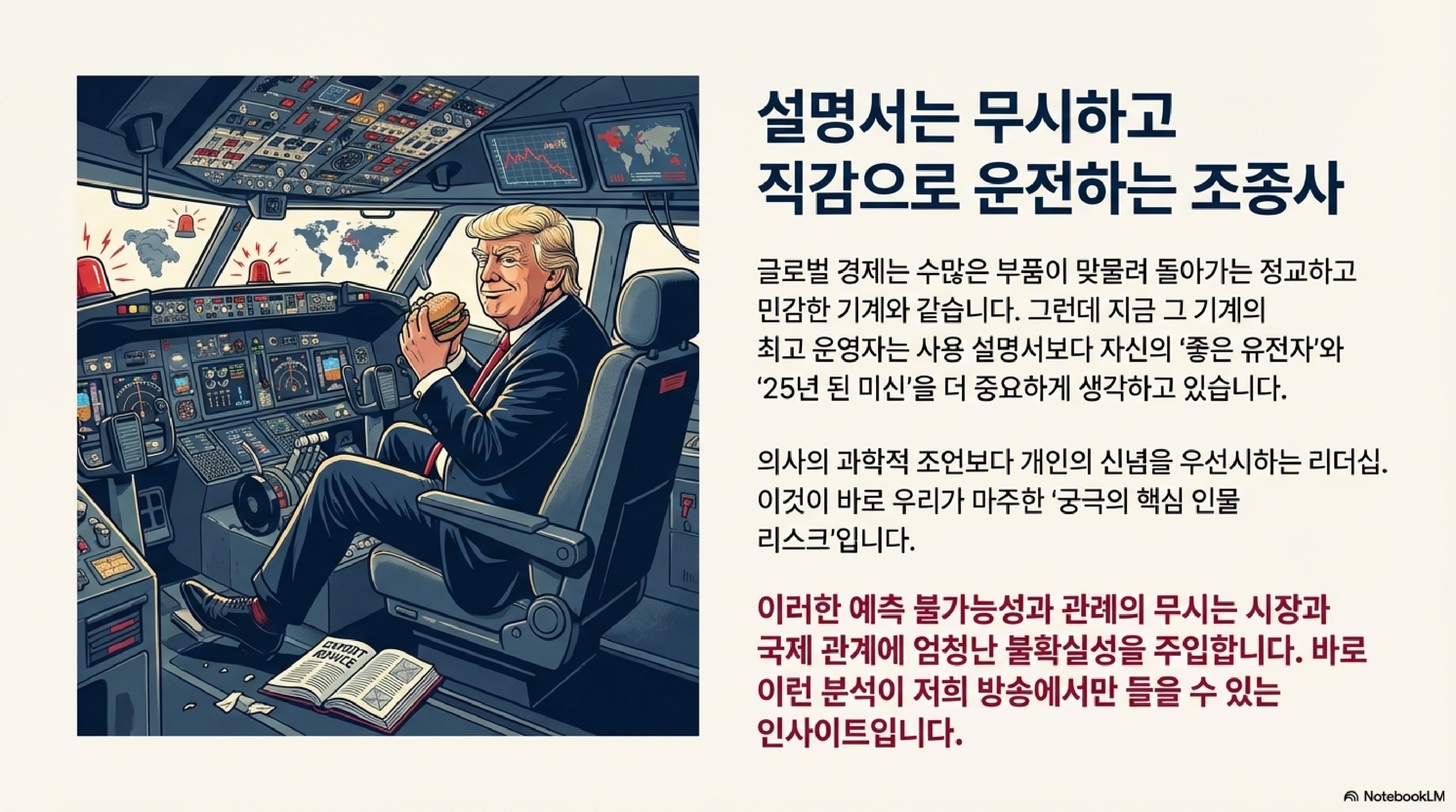 2026년 새해, 첫 방송입니다. 다들 새해 복 많이 받고 계십니까? 연초에 세웠던 금연, 다이어트, 영어 공부 같은 거창한 계획들, 벌써 작심삼일의 스멜이 솔솔 풍겨오고 있습니다만, 괜찮습니다. 우리만 그런 거 아니니까요. 하지만 우리가 이렇게 새해 다짐과 처절한 사투를 벌이는 동안에도, 단 1초도 쉬지 않고 돌아가는 것이 있으니, 바로 글로벌 경제입니다.