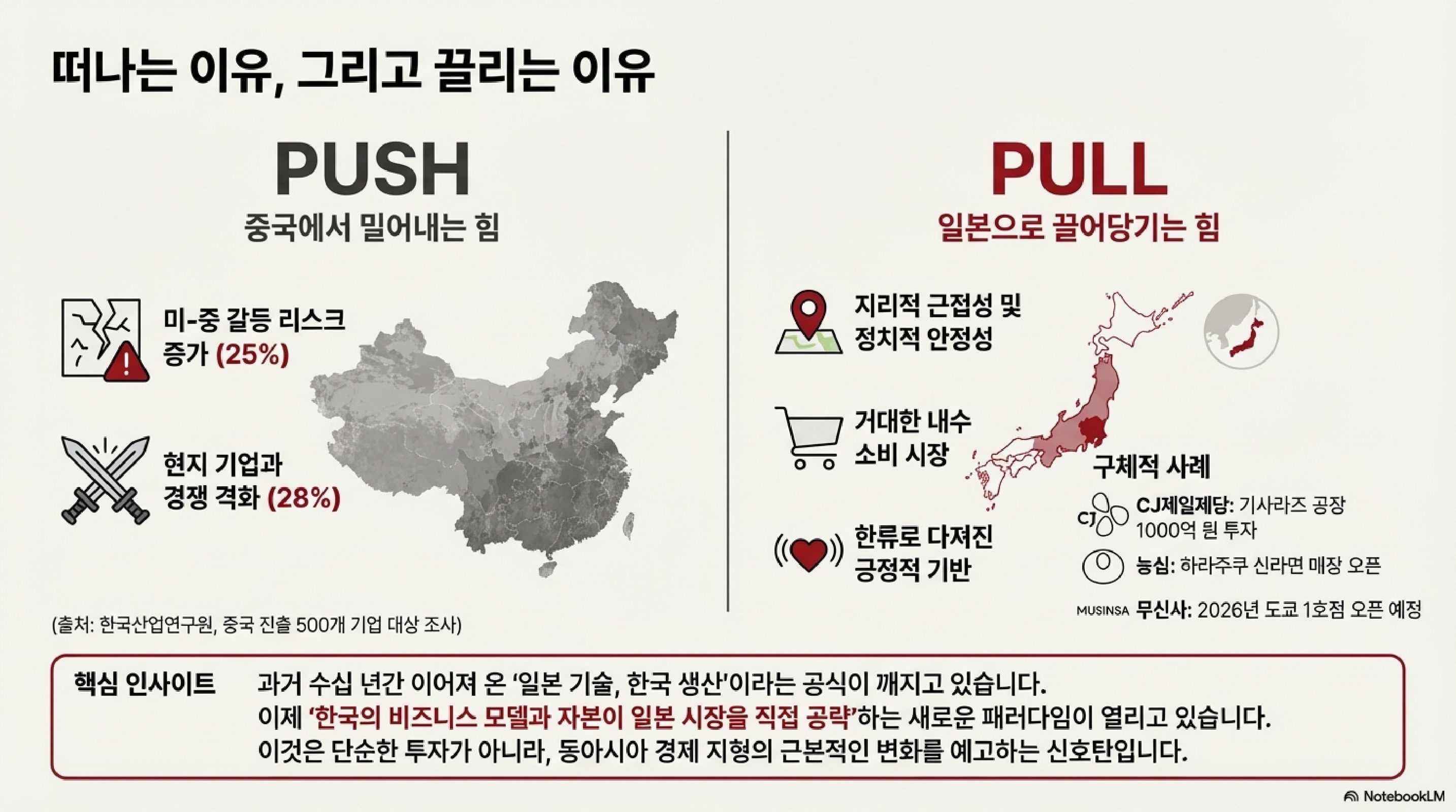 CJ제일제당이 일본에 식품 공장을 짓고, '신라면'의 농심이 도쿄 하라주쿠에 라면 가게를 열고, 패션 공룡 무신사가 일본 1호점 개장을 준비하고 있습니다. 이런 소비재 기업뿐만이 아닙니다. 반도체 스타트업 '리벨리온즈'나 카카오헬스케어 같은 최첨단 기술 기업들까지 일본으로 향하고 있죠.