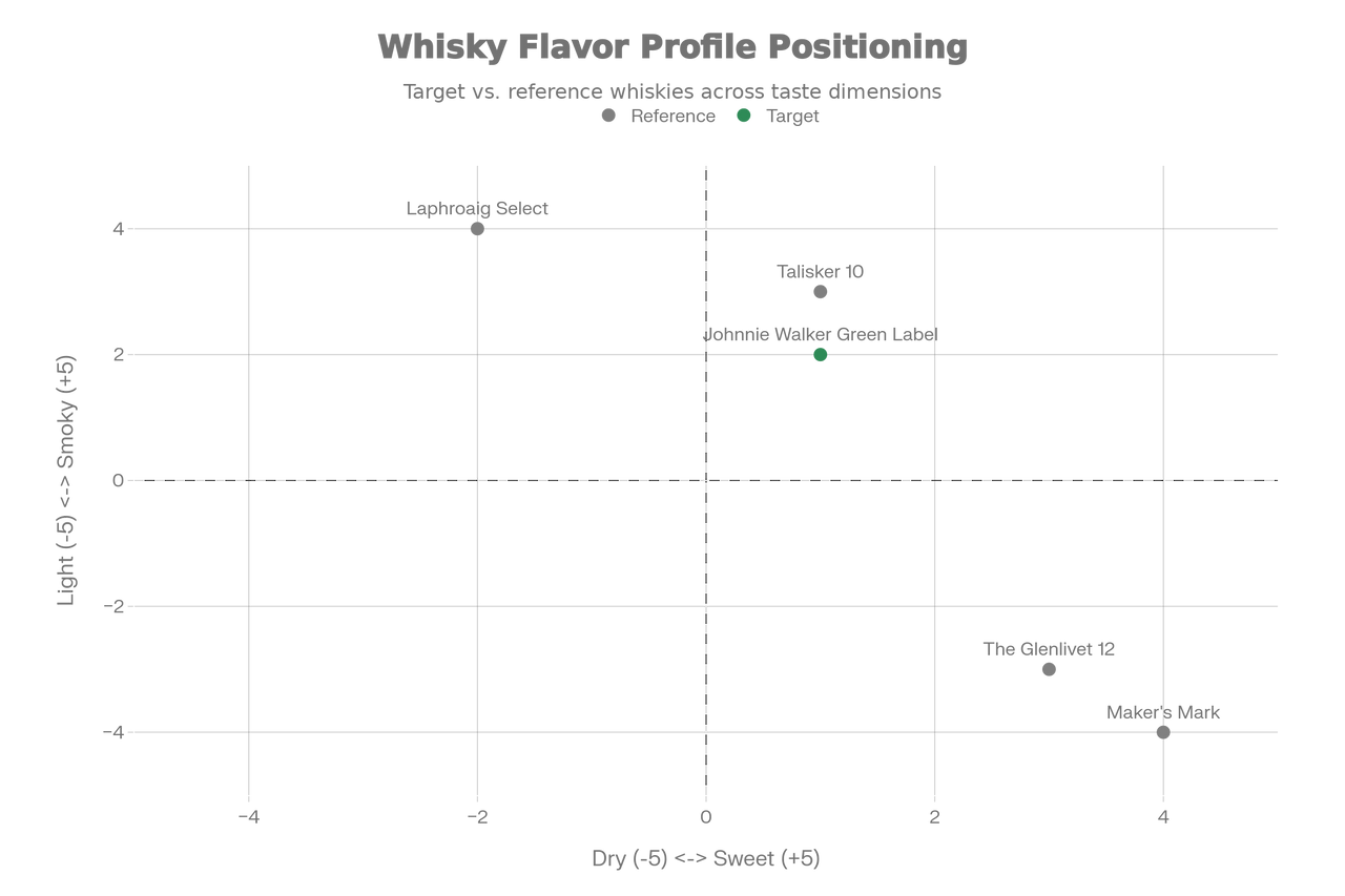 제공해주신 기준(상하: 스모키/라이트, 좌우: 드라이/스위트)에 따라 조니워커 그린라벨의 위치를 시각화했습니다.
