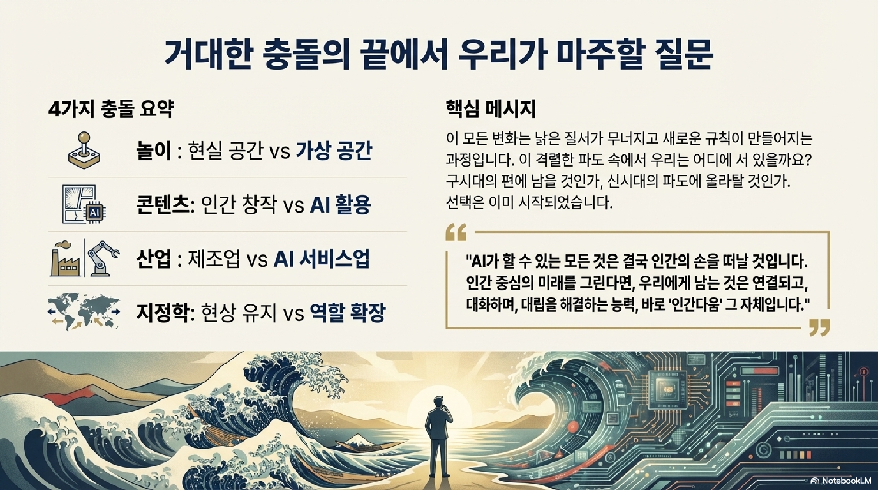 오늘 우리는 일본 사회의 양극화를 보여주는 ‘놀이 격차’ 문제, 기술 발전의 명암을 드러낸 ‘AI 만능주의’ 논란, 그리고 국제 질서의 근간을 흔드는 ‘트럼프 시대의 귀환’ 가능성까지 세 가지 주제를 살펴봤습니다. 이 모든 이야기는 결국 ‘격차’, ‘기술’, 그리고 ‘힘의 논리’라는 세 개의 키워드로 연결됩니다.